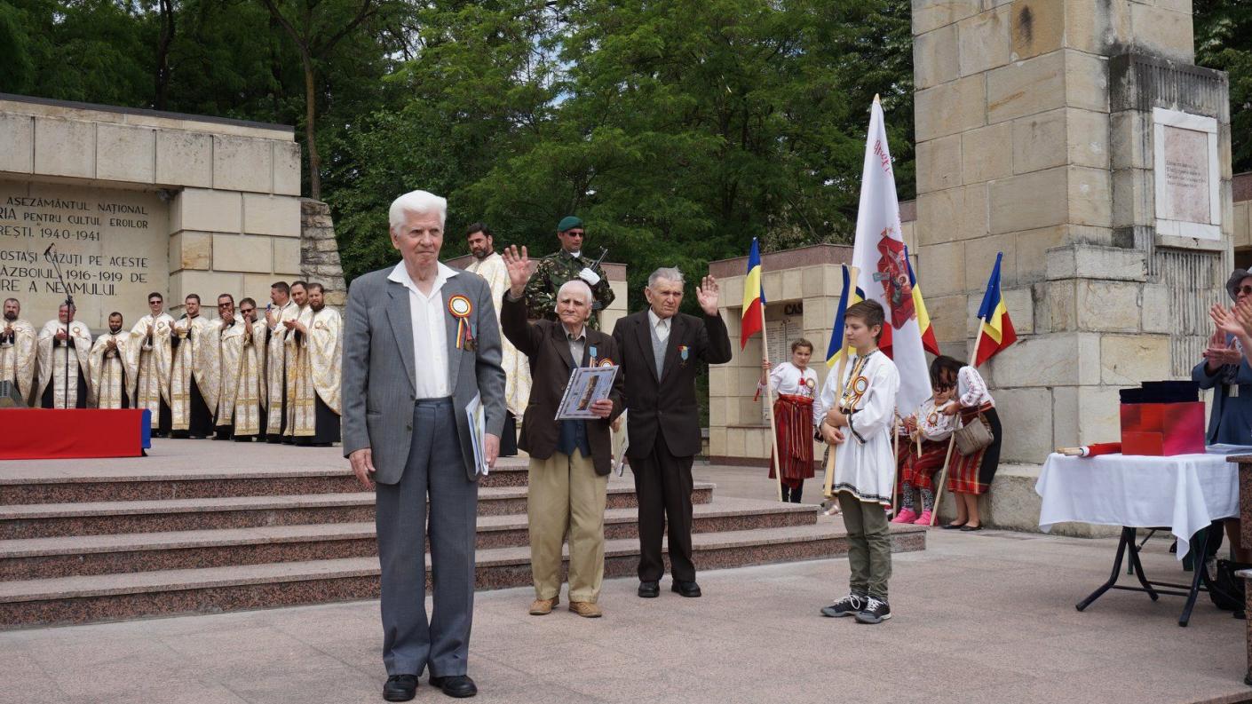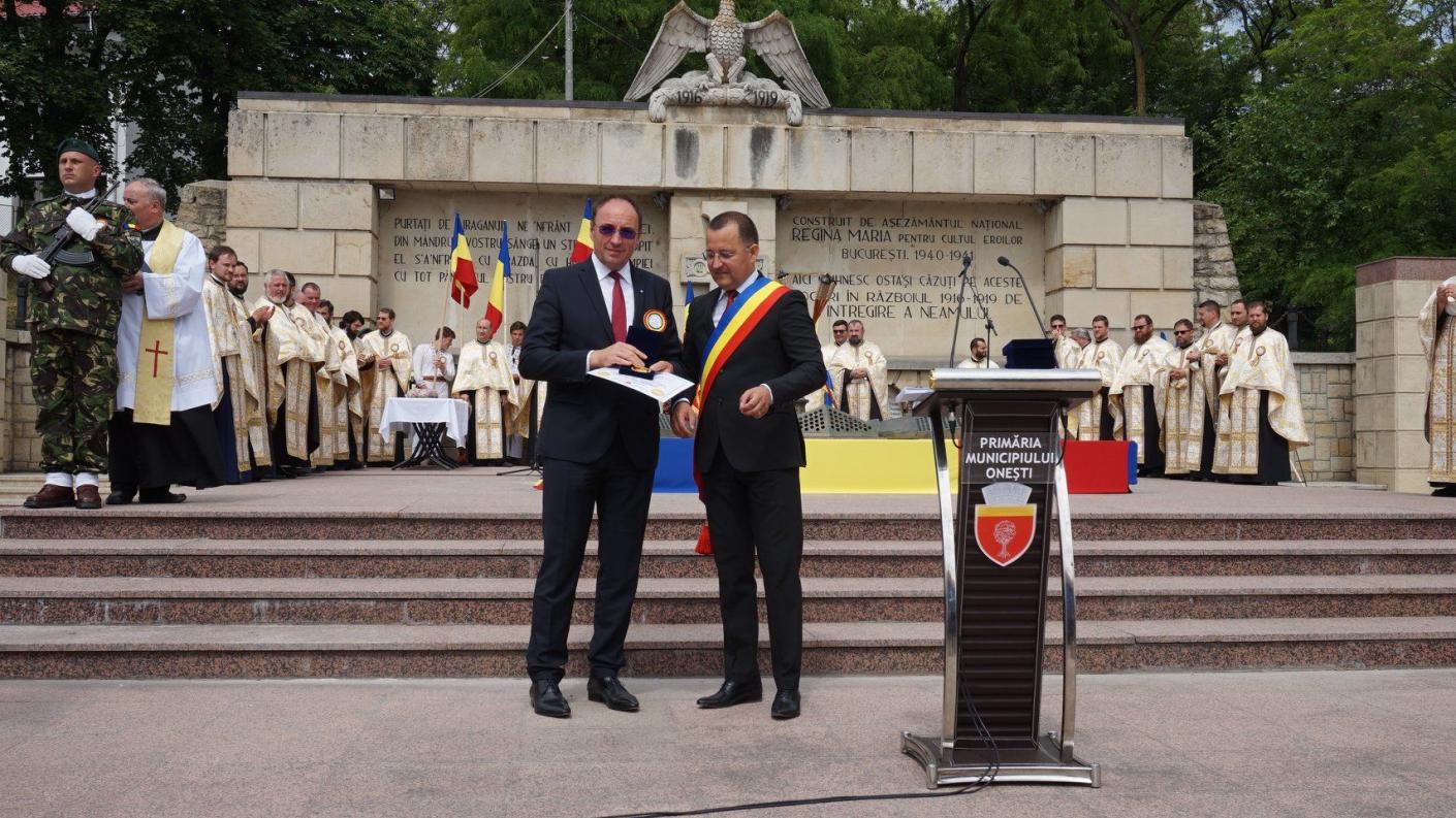 După aceasta, Consiliul Local Onești a premiat pe cei șase veterani de război prezenți, iar reprezentanți ai instituțiilor implicate în acest eveniment au depus coroane de flori la monumentul eroilor. La final, a avut loc o defilare și o paradă de tehnică militară, urmată de dezvelirea monumentului ridicat pentru a marca împlinirea a 100 de ani de la “Marea Unire”. Istoria ridicării acestui monument la poarta de vest a Oneștiului a fost consemnată într-un Hrisov semnat de autoritățile religioase, militare și administrative prezente, document ce a fost citit de părintele Ciprian Ioan Ignat, secretar eparhial.
