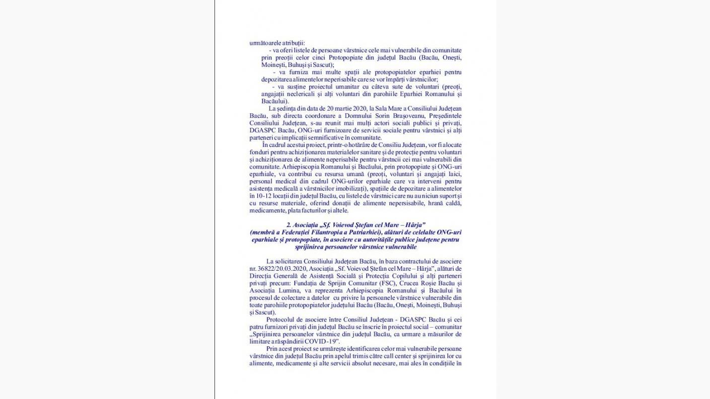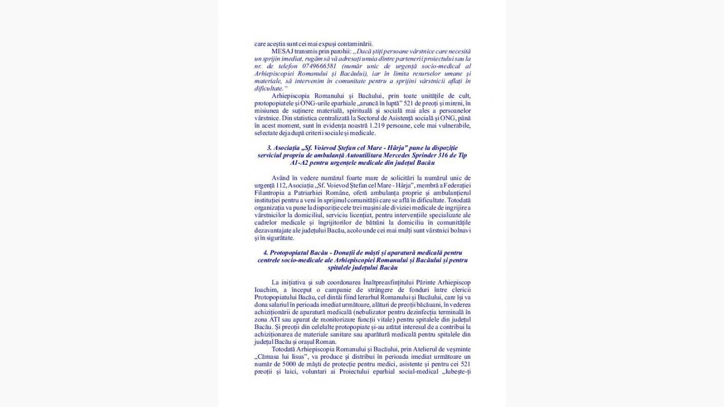 La ceas aniversar, în ziua împlinirii a 66 de ani de viață, IPS Părinte Arhiepiscop Ioachim a solicitat alcătuirea unui raport sinteză privind activitățile de asistență socială și socio-medicală, în contextual pandemiei cu noul tip de coronavirus (COVID-19). Acesta prezintă modul în care Arhiepiscopia Romanului și Bacăului se implică, alături de autoritățile publice județene, în sprijinirea persoanelor vulnerabile din județul Bacău, în special persoanele vârstnice vulnerabile din toate parohiile protopopiatelor județului Bacău (Bacău, Onești, Moinești, Buhuși și Sascut). De asemenea, parohiile și mănăstirile de pe cuprinsul Arhiepiscopiei Romanului și Bacăului au făcut și continuă să facă donații de măști și aparatură medicală insitituțiilor și voluntarilor implicați în ajutorarea celor infectați cu noul tip de coronavirus. Asociația „Sf. Voievod Ștefan cel Mare - Hârja” pune la dispoziție serviciul propriu de ambulanță, Autoutilitara Mercedes Sprinder 316 de Tip A1-A2 și ambulanțierul, pentru urgențele medicale din județul Bacău, iar Protopopiatul Bacău a oferit unicul dispozitiv pentru dezinfectarea mașinilor de ambulanță și MAI din județul Bacău.