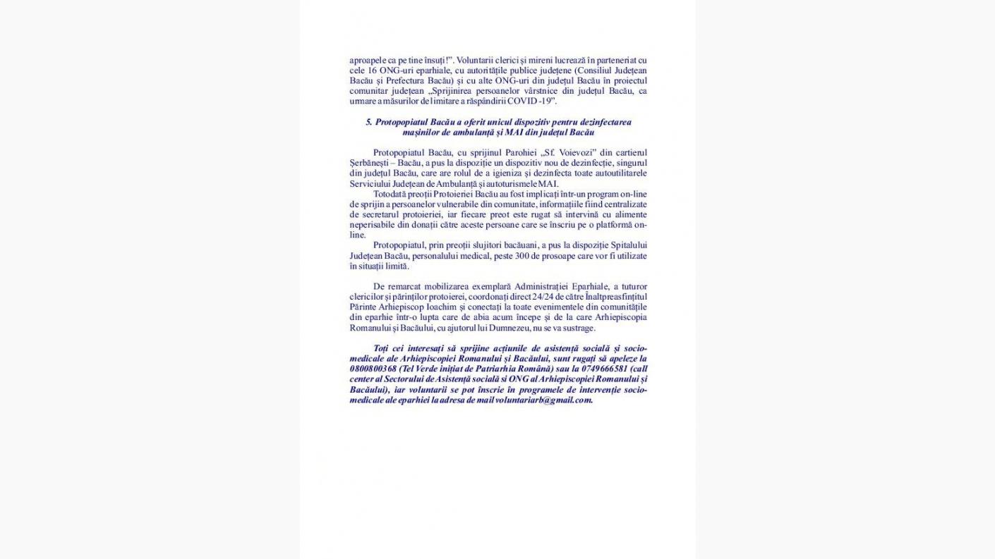 IPS Părinte Arhiepiscop Ioachim îndeamnă pe toți cei interesați să sprijine acțiunile de asistență socială și socio-medicale ale Arhiepiscopiei Romanului și Bacăului să apeleze la telefonul 0749666581 (call center al Sectorului de Asistență socială și ONG al Arhiepiscopiei Romanului și Bacăului), iar voluntarii să se înscrie în programele de intervenție socio-medicale ale eparhiei la adresa de mail voluntariarb@gmail.com . (Mioara Ignat)