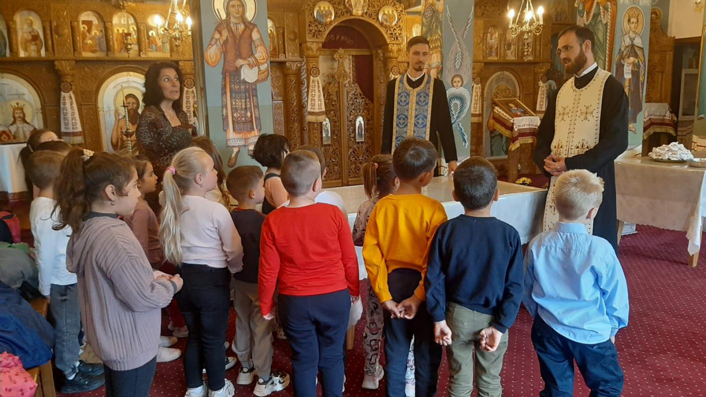 Micii școlari, însoțiți de doamna educatoare Livia Grădinaru și de doamna învățătoare Raluca Alexandra Cosăcea, au poposit dis-de-dimineață în lăcașul de cult, participând la Sfânta Liturghie, oficiată de părintele Iulian Botezatu și de părintele Florin Robert Blănaru, profesorul lor de Religie.