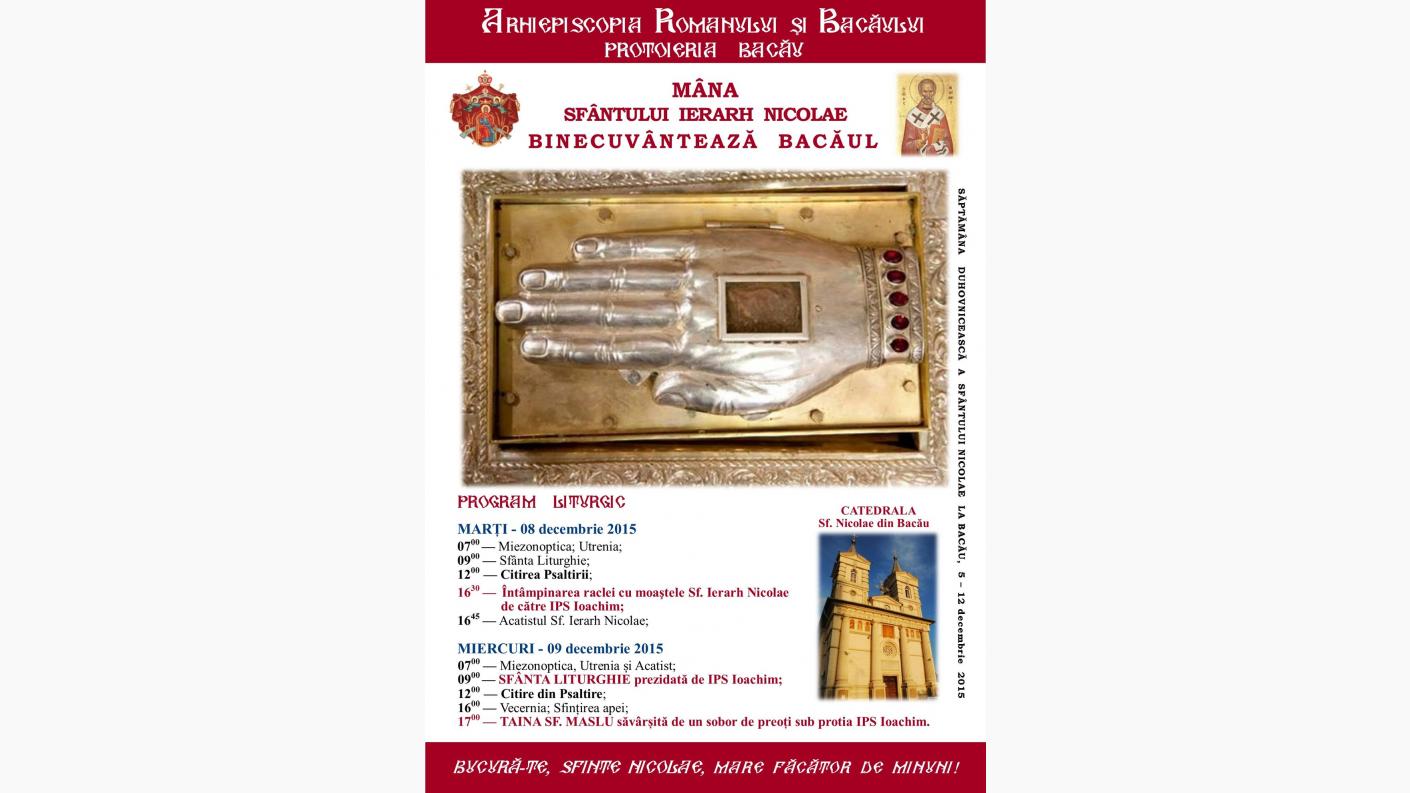 Astfel, marți – 08 decembrie, în jurul orei 17:00, cu binecuvântarea Preafericitului Părinte Patriarh Daniel, racla cu parte din mâna dreaptă a Sfântului Nicolae va fi adusă de la Biserica “Sf. Gheorghe Nou” din București la Biserica-Catedrală „Sfântul Nicolae” din Bacău.