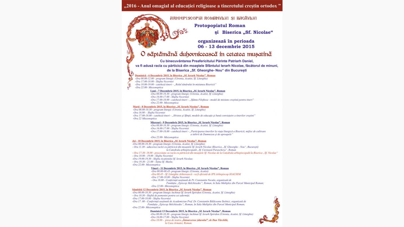 Luni - 7 Decembrie 2015, în Biserica „Sf. Ierarh Nicolae”, Roman