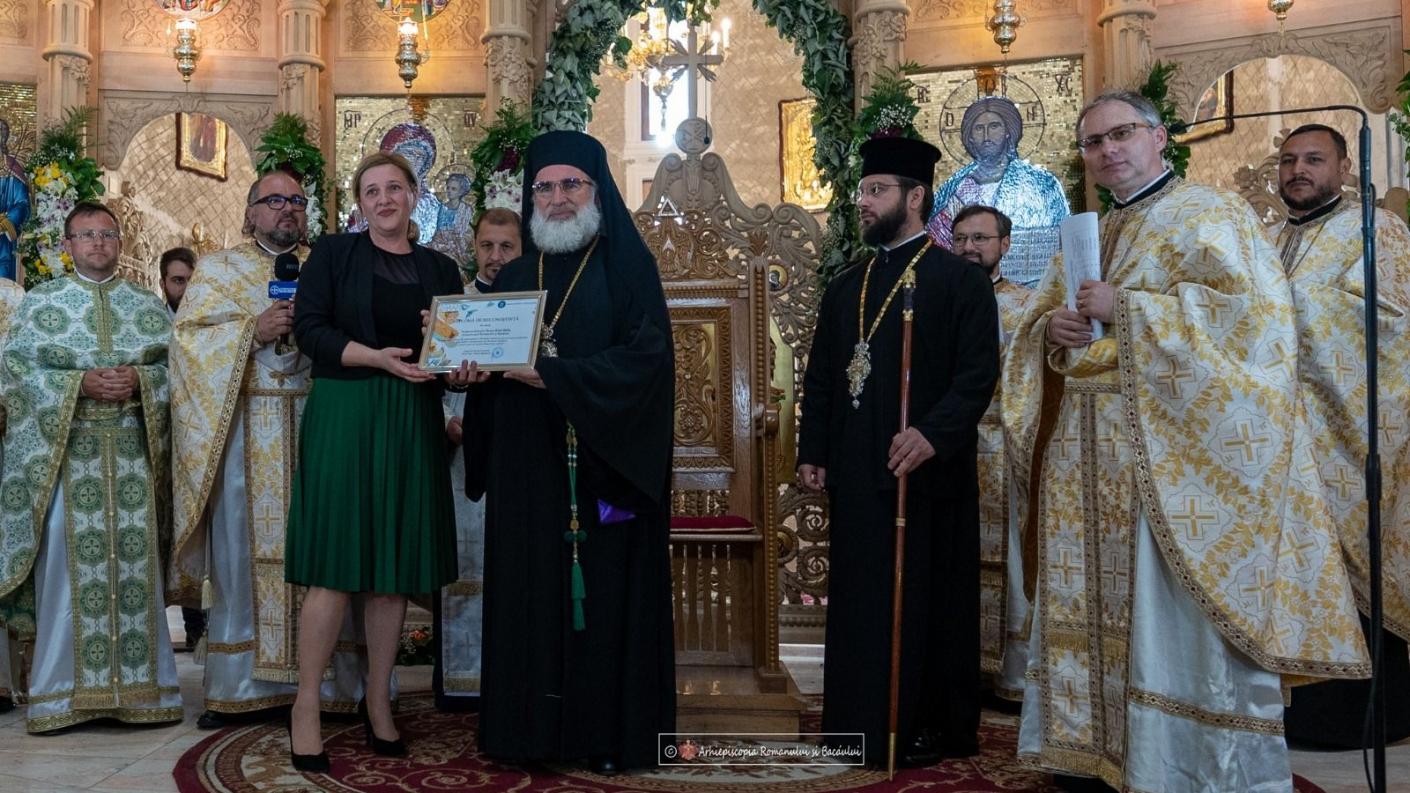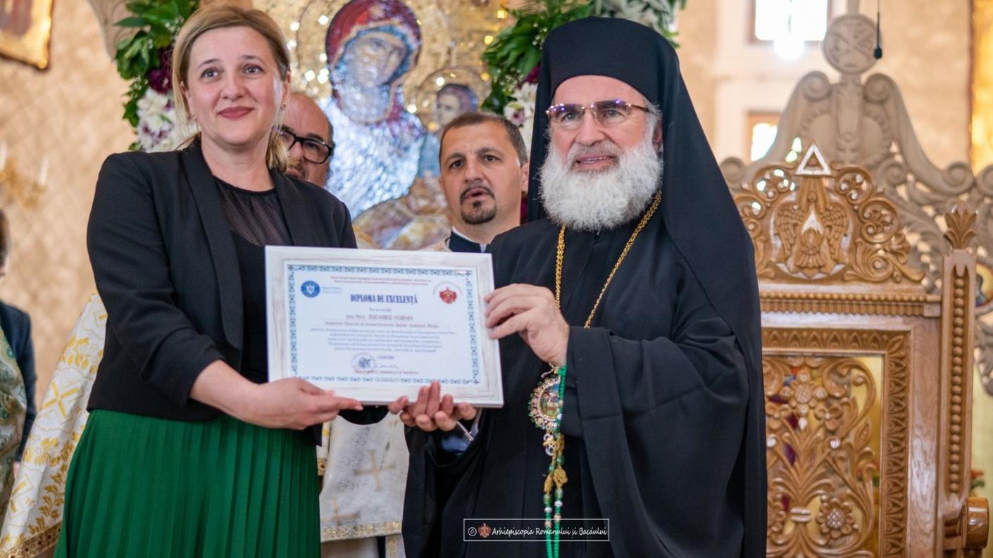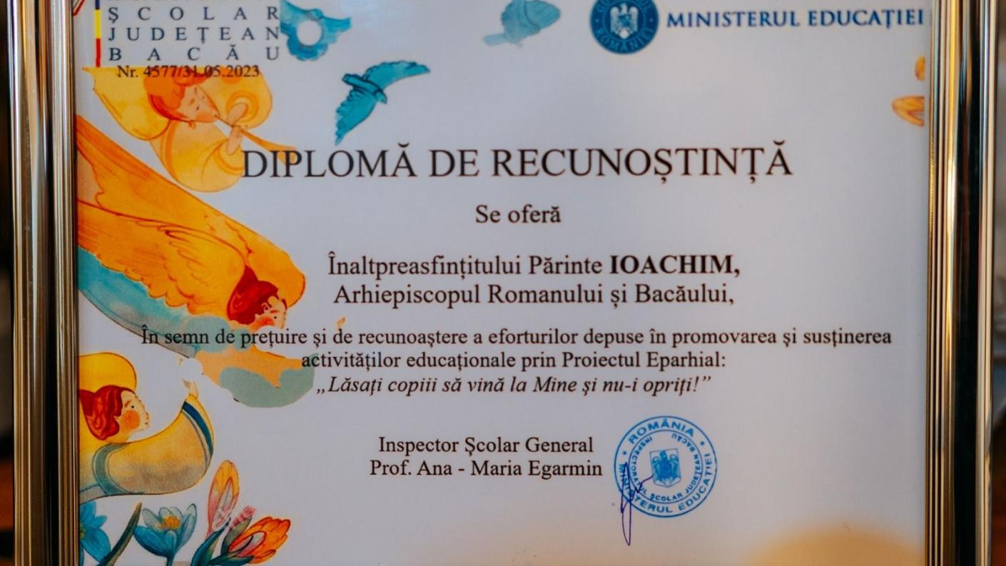 În alocuțiunea sa, doamna inspector școlar general Ana-Maria Egarmin a mulțumit Înaltpreasfințitului Părinte Ioachim pentru excelenta colaborare dintre Inspectoratul Școlar Județean Bacău și Arhiepiscopia Romanului și Bacăului în cultivarea moralității tinerilor, și a acordat Părintelui Ierarh, în semn de prețuire și de recunoaștere a eforturilor depuse în susținerea activităților educaționale din județul Bacău, prin Proiectului Eparhial ,,Lăsați copiii să vină la Mine și nu-i opriți!”, o Diplomă de Recunoștință. De asemenea, Înaltpreasfințitul Părinte Ioachim a oferit doamnei Inspector școlar general Diploma de Excelență, pentru dăruirea arătată în promovarea valorilor spirituale și culturale ale neamului românesc.