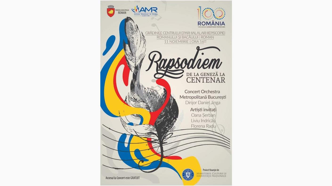 În deschiderea seratei muzicale, domnul Lucian Micu, primarul municipiului Roman, a adresat mulțumiri invitaților speciali și a urat audiție plăcută publicului romașcan. Apoi, de pe scena special amenajată pentru acest eveniment cultural, membrii Orchestrei Metropolitane București și-au arătat virtuozitatea interpretând magistral, sub genericul Rapsodiem - de la Geneză la Centenar, piese muzicale adunate într-un florilegiu care a încântat auditoriul. Ignorând condițiile meteo nefavorabile, publicul romașcan s-a bucurat de acest regal muzical răsplătind cu plauze măiestria artiștilor.