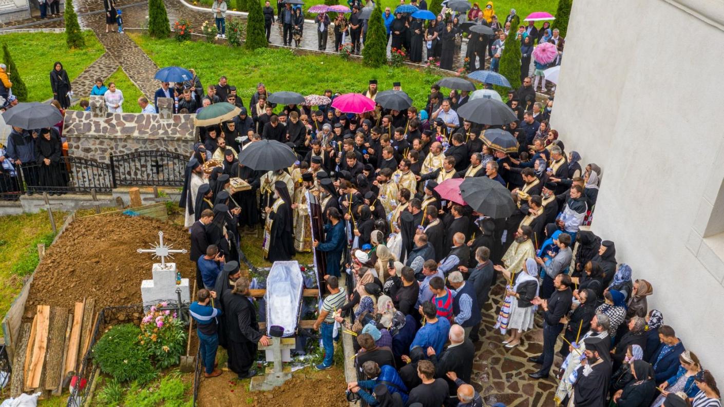 După Sfânta Liturghie săvârșită în foișorul-paraclis situat în latura de răsărit a bisericii cu hramul Sfinții Arhangheli Mihail și Gavriil de soborul restrâns al stareților mănăstirilor din eparhie, sub protia Părintelui Arhimandrit Pimen Costea, vicar eparhial, în mijlocul mulțimii îndoliate a venit ierarhul Romanului și Bacăului pentru a prohodi sufletul Părintelui Serafim Huzdup, cel care i-a fost colaborator, ucenic și fiu duhovnicesc.