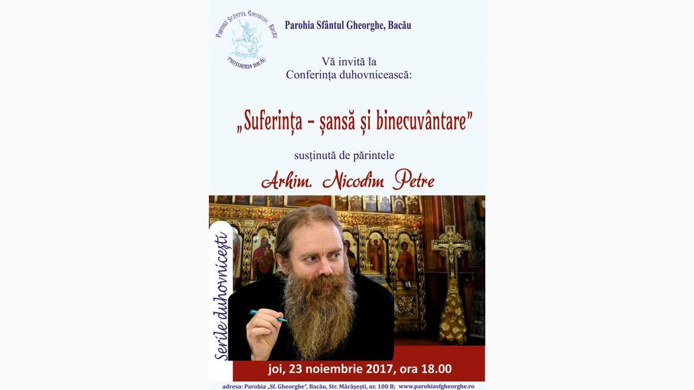 Cu binecuvântarea Înaltpreasfințitului Părinte Ioachim, Arhiepiscopul Romanului și Bacăului, Biserica Parohiei „Sfântul Gheorghe” din municipiul Bacău a găzduit joi, 23 noiembrie 2017, începând cu ora 18.00, un eveniment cultural-catehetic deosebit în cadrul Serilor duhovnicești ale parohiei, avându-l ca oaspete pe Preacuviosul Părinte Arhimandrit Nicodim Petre, Consilier al Sectorului de Misiune, Statistică şi Prognoză Pastorală al Arhiepiscopiei Iaşilor. Evenimentul a debutat cu săvârșirea unei slujbe de Parastas pentru pr. profesor Dumitru Stăniloaie, pr Costantin Galeriu și pr. Ioanichie Bălan.