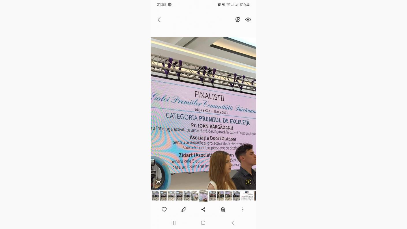 La Gala Premiilor Comunităţii Băcăuane, ediţia a XX-a, care a avut loc în seara zilei de 18 mai, au fost invitați să participe finaliștii acestei ediții pentru toate cele 4 categorii: Categoria persoane fizice, Categoria instituţii şi ONG-uri, Categoria firme şi companii și Premiul de Excelenţă, unde finaliștii nominalizați au fost Pr. IOAN BÂRGĂOANU, pentru întreaga activitate umanitară desfășurată în cadrul Protopopiatului Onești; Asociația Door2Outdoor pentru activitățile și proiectele dedicate promovării sportului pentru persoane cu dizabilități; Zidart (Asociația Ingenious Drama) pentru cele 5 ediții internaționale de Street Art Festival care au regenerat imaginea și cultura orașului Bacău – aceștia din urmă fiind declarați câștigători ai premiului de excelență al acestei ediții.