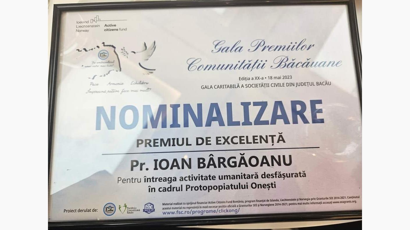 Anul acesta, între finaliști s-a aflat și părintele Ioan Bârgăoanu, nominalizat la categoria Premiu de Excelență pentru întreaga activitate umanitară desfășurată în cadrul Protopopiatului Onești. Aflând cu surprindere despre nominalizarea făcută, pr. Ioan Bârgăoanu, din încredințarea IPS Părinte Arhiepiscop Ioachim coordonator al activităților derulate în Protoieria Onești, ne-a declarat: