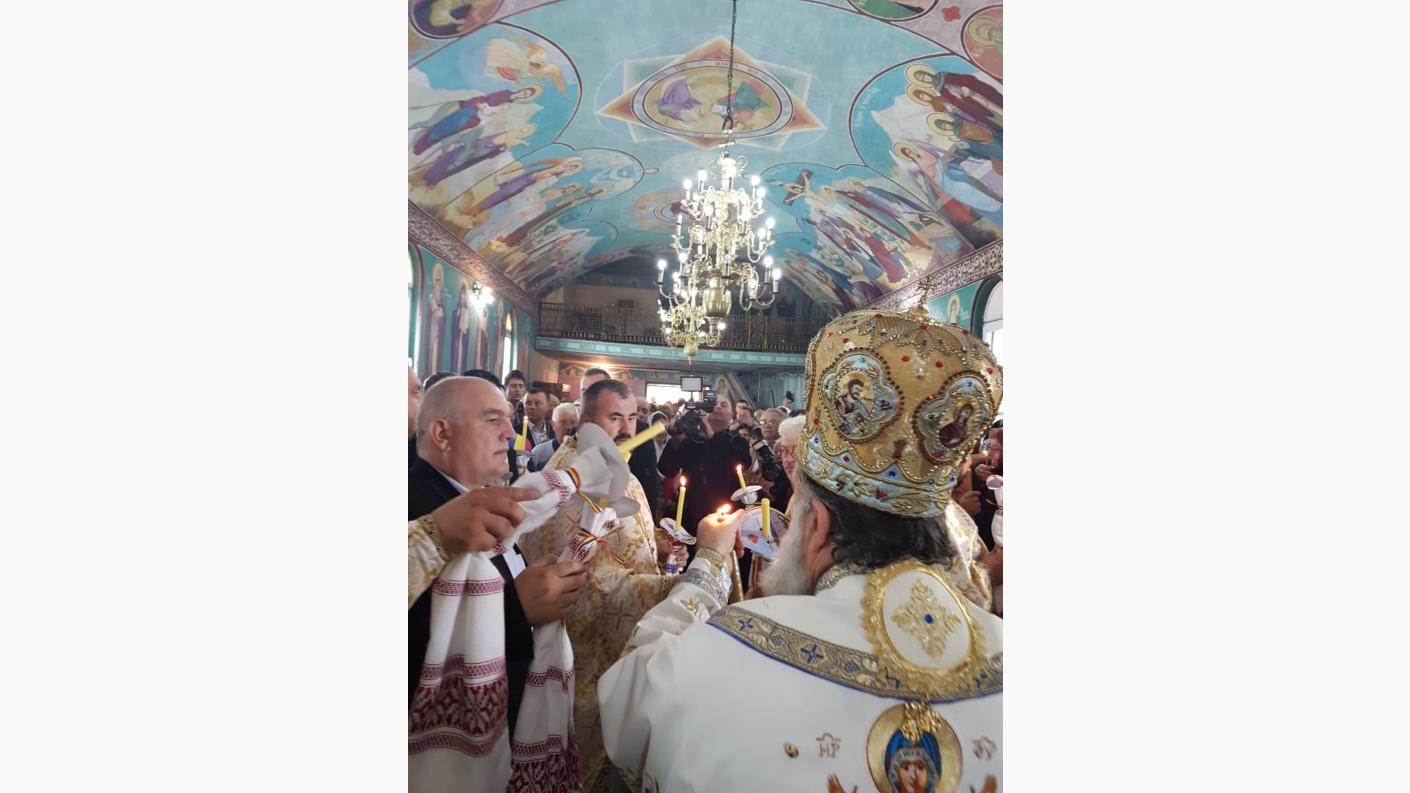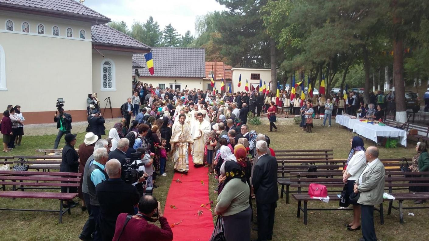 Preacucernicul părinte Ciprian Ignat, secretar eparhial, a dat citire Hrisovului de sfințire a Bisericii cu hramurile “Sfântul M. Mc. Gheorghe” și “Sfântul Gheorghe Pelerinul de la Mănăstirea Văratec”, precum și a Așezământului Social Filantropic “Sfântul Apostol Toma”. A urmat slujba de târnosire a sfântului lăcaș săvârșită de către Înaltpreasfințitul Părinte Ioachim care a fost înconjurat de un numeros sobor de preoți, alături de părintele protopop Ioan Bârgăoanu, de copii și tineri în straie populare, purtând în mâini steaguri tricolore, transformând acest locaș în poartă a cerului și loc de întâlnire cu Dumnezeu.