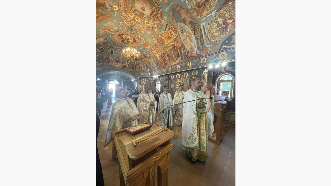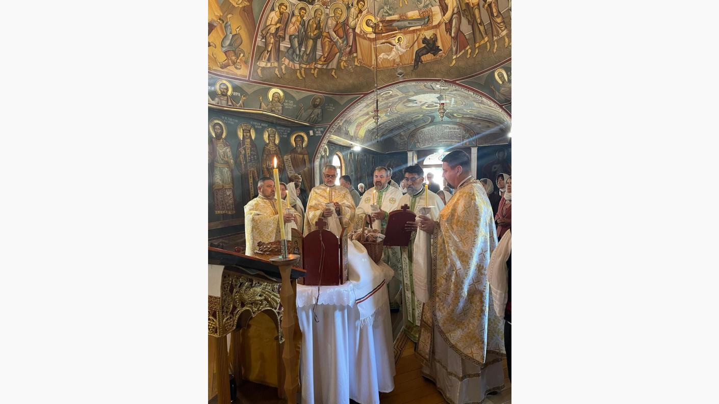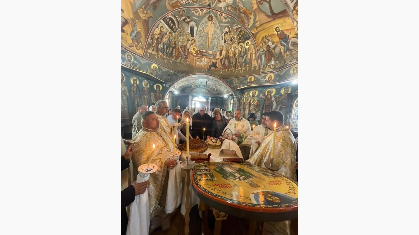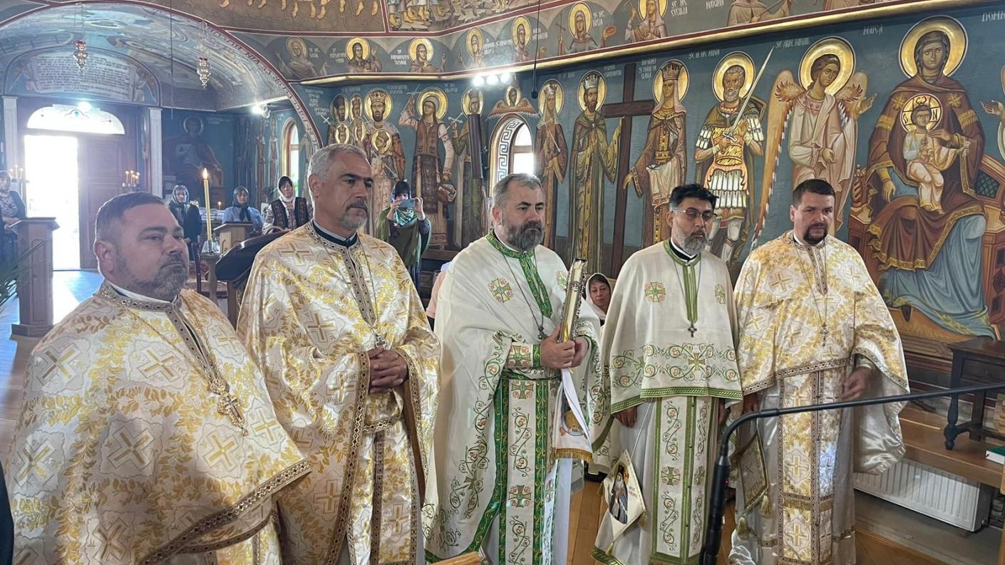 Sfânta și Dumnezeiasca Liturghie a fost săvârșită de un sobor de preoți sub protia părintelui protoiereu Ioan Bârgăoanu, răspunsurile la strană fiind date de un grup de preoți, apropiați ai părintelui paroh Gheorghe Aramă, conduși de părintele Elisei Roncea, care au înfrumusețat rugăciunea intonând un frumos Axion în limba greacă.
