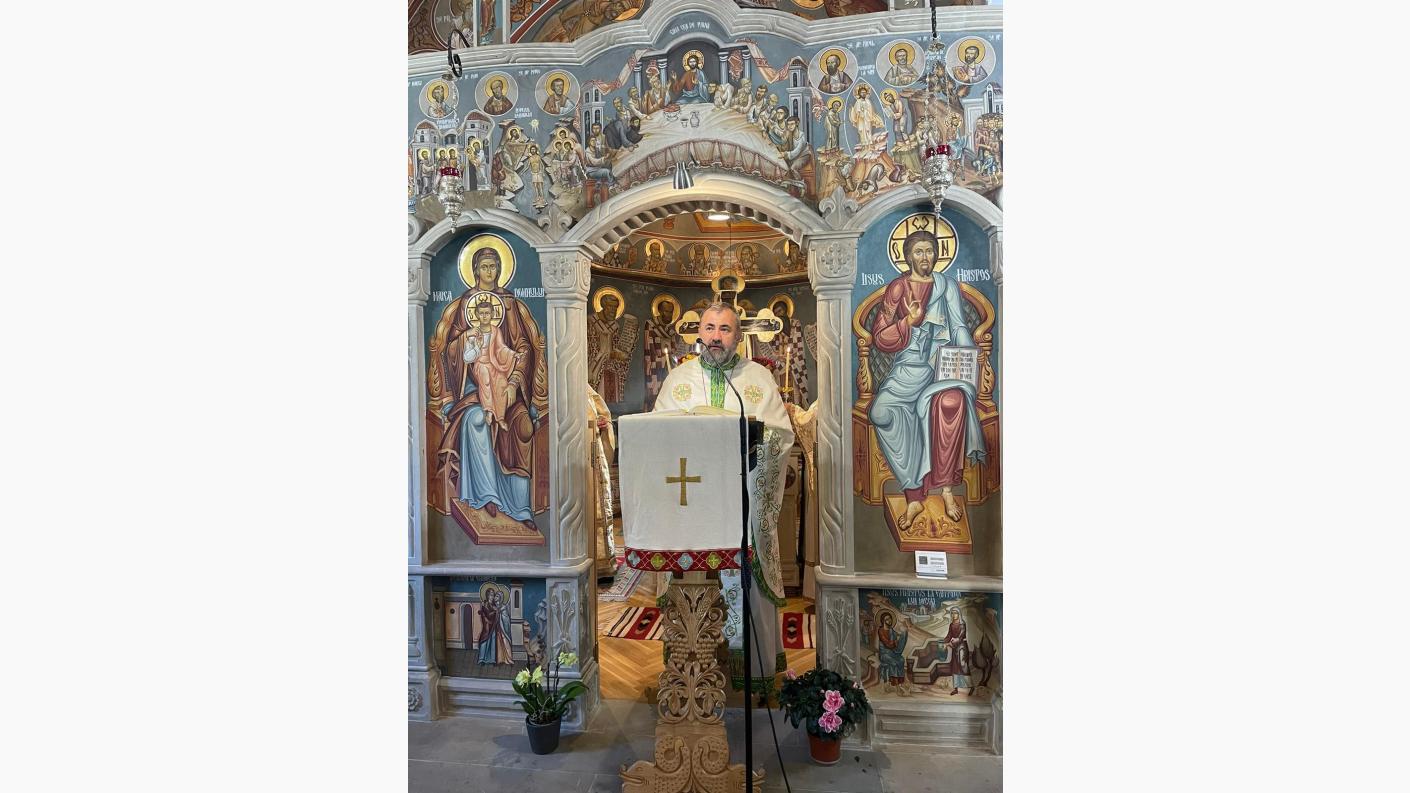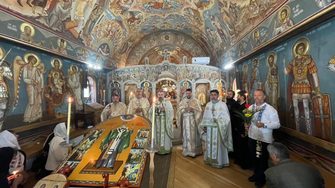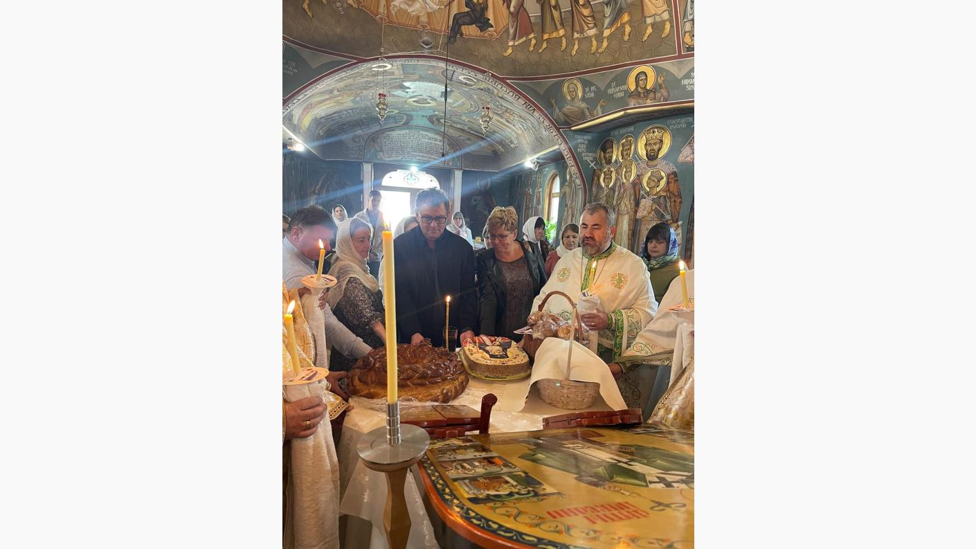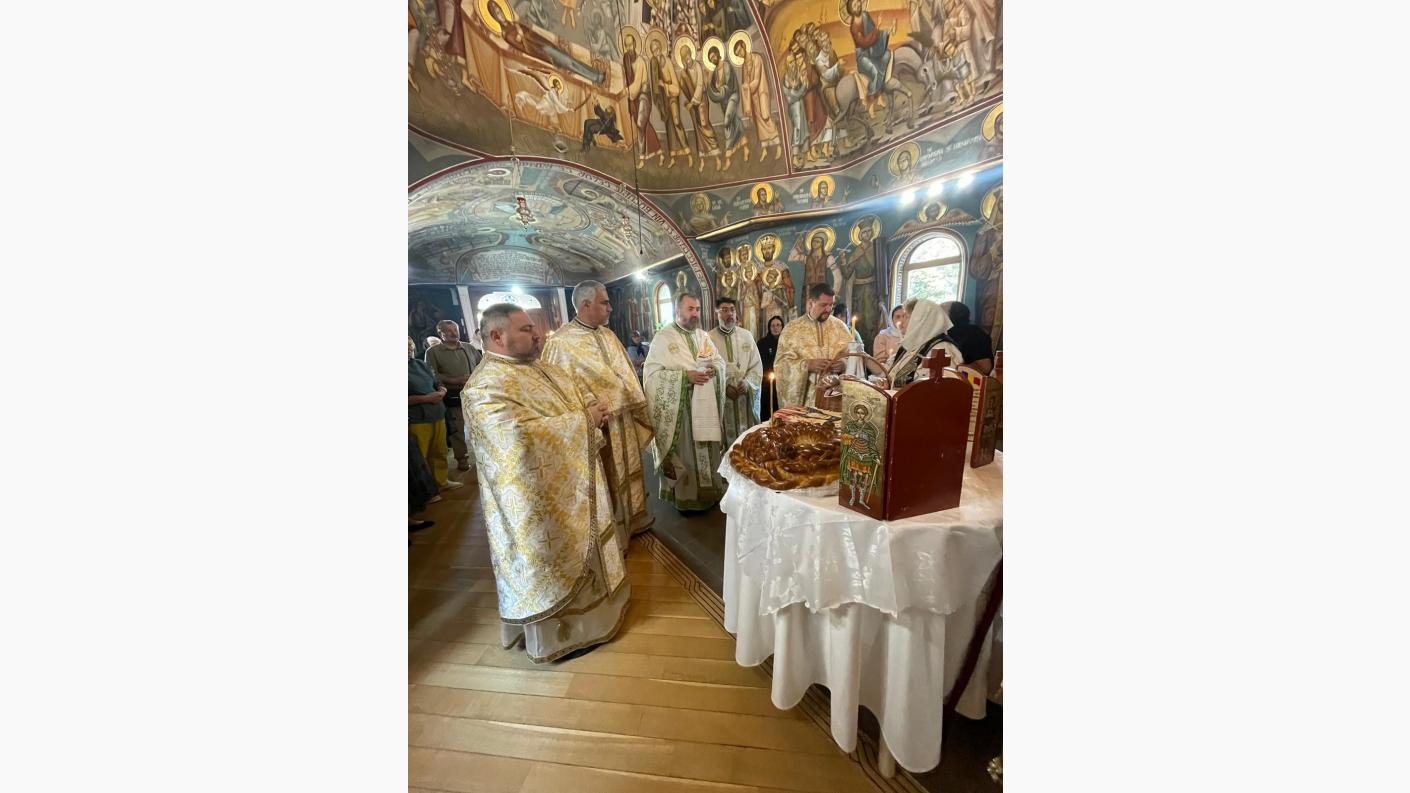 Sfânta și Dumnezeiasca Liturghie a fost săvârșită de un sobor de preoți sub protia părintelui protoiereu Ioan Bârgăoanu, răspunsurile la strană fiind date de un grup de preoți, apropiați ai părintelui paroh Gheorghe Aramă, conduși de părintele Elisei Roncea, care au înfrumusețat rugăciunea intonând un frumos Axion în limba greacă.