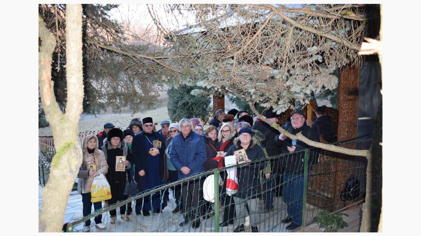 - Prima oprire a avut loc la Mănăstirea „Brâncoveanu” de la Sâmbăta de Sus, unde pelerinii s-au rugat la mormântul Sfântului Cuvios Serafim cel Răbdător (prăznuit pe 20 decembrie) și la mormântul părintelui Teofil Părăian;