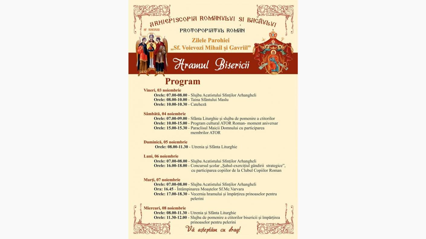 În contextul Zilelor Parohiei ,,Sfinții Voievozi”, în perioada 4-6 noiembrie 2017, în Biserica Albă din Roman a avut loc prima ediție a concursului școlar „Șahul-exercițiul gândirii strategice”, la care au participat elevi pasionați de acest sport nobil, care își petrec cu folos timpul liber la atelierele creative gândite de conducerea Clubului Copiilor Roman și prevăzute în programa școlară specifică acestei instituții, dar și întâlnirea tinerilor din ATOR, filiala Roman, la împlinirea unui an de la constituirea asociației.