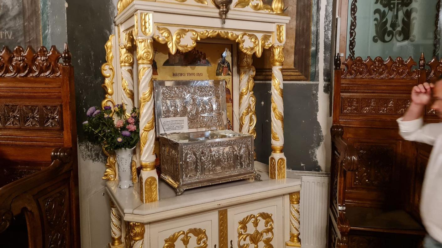Sfânta Raclă cu Cinstitul Lemn al Sfintei Cruci, cu moaștele Sfântului Ioan Botezătorul și cu moaștele Sfinților Mucenici Gheorghe, Trifon, Teodor Tiron, Elefterie, Haralambie și Paraschevi a ajuns înapoi în baldachinul Bisericii „Sfintei Cruci și a Sfântului Vasile cel Mare” - Victoria din București.