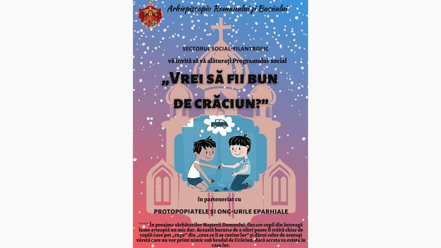 La jumătatea lunii noiembrie 2020, cu binecuvântarea Înaltpreasfințitului Părinte Ioachim, a avut loc lansarea programului eparhial ”Vrei să fii bun de Crăciun? ”, proiect ce și-a propus inițial identificarea a minim 500 de copii din mediile defavorizate de pe teritoriul întregii eparhii a Romanului și Bacăului, copii ce urmau să primească de la semenii lor (copii de vârsta lor, cu posibilități financiare) cadoul mult visat, în ziua de Crăciun. Astfel că până la data de 29.12.2020 s-au strâns 4237 de scrisori sau desene din partea copilașilor mai puțin fericiți și tot atâtea cadouri de la copiii care au putut „rupe” din „ceea ce li se cuvenea lor” și au dăruit celor de aceeași vârstă ca și ei, la care exista posibilitatea să nu primească nimic sub bradul de Crăciun.
