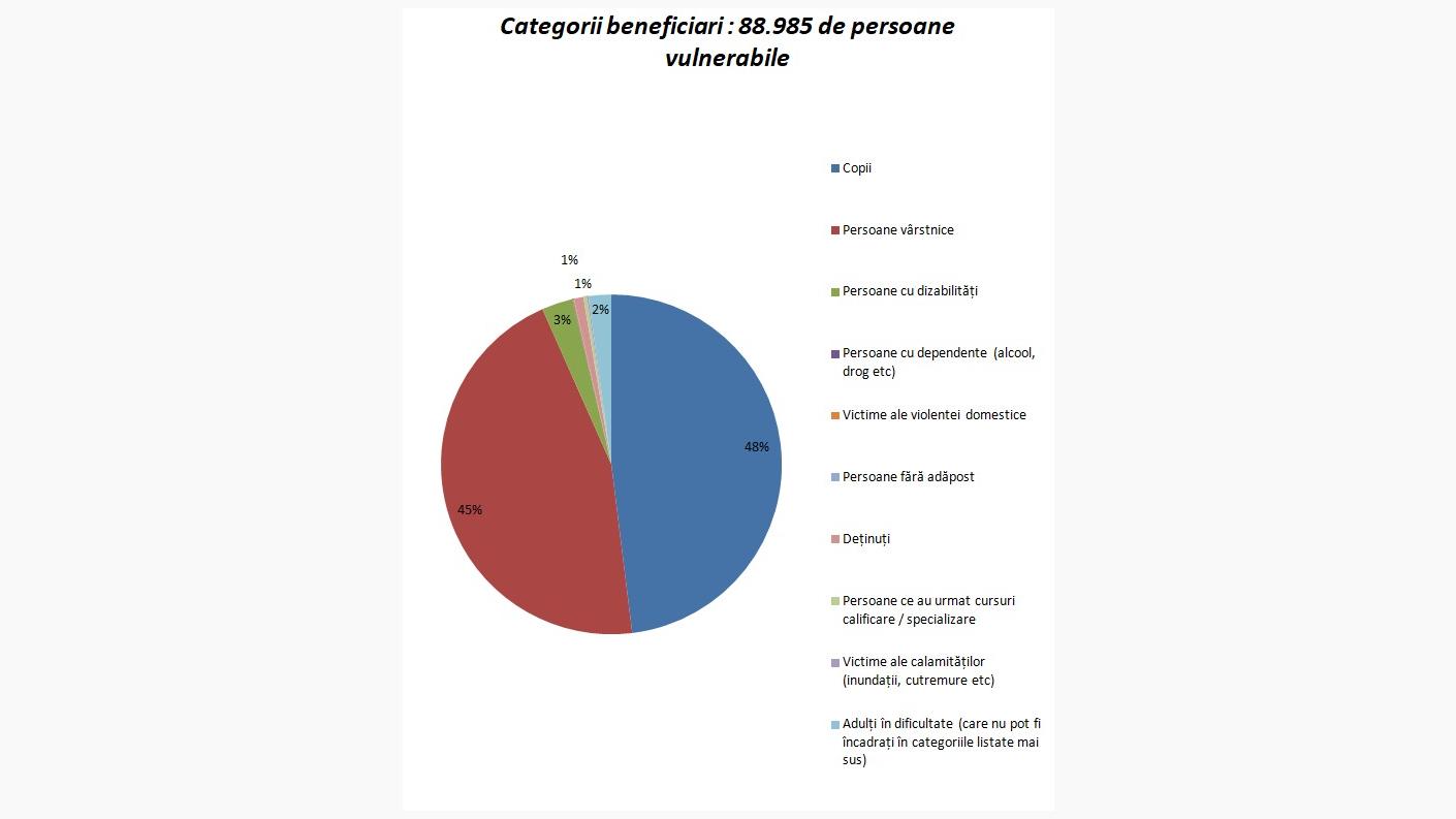 - Cantinele sociale, prin programele de oferire a hranei calde: „Prânzul pe roate”, „Masa Bucuriei”, „Prânzul Ștefanian”, „Masa pe roți”, au continuat și în acest an să sprijine atât familiile încercate, cât și pe cei mai defavorizați, prin oferirea unei mese calde zilnice sau ocazional, pentru 4123 beneficiari, provenind din familii defavorizate sau marginalizate. Valoarea totală a programului a fost suma de 1.771.150 RON.