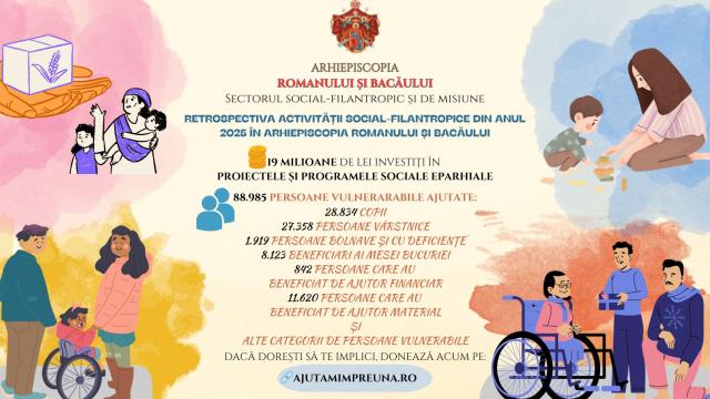 Arhiepiscopia Romanului și Bacăului, prin Sectorul Social–Filantropic și Misionar, cu binecuvântarea și implicarea directă a Înaltpreasfințitului Părinte Arhiepiscop Ioachim, în colaborare cu birourile de asistență socială din protopopiate, mănăstirile, parohiile și ONG-urile eparhiale, precum și cu sprijinul preoților de caritate și al partenerilor publici și privați, a desfășurat, pe parcursul anului 2025, 14 programe și 6 proiecte eparhiale, oferind sprijin direct pentru aproape 89.000 de persoane vulnerabile, valoarea totală a fondurilor alocate depășind 19,3 milioane de lei.