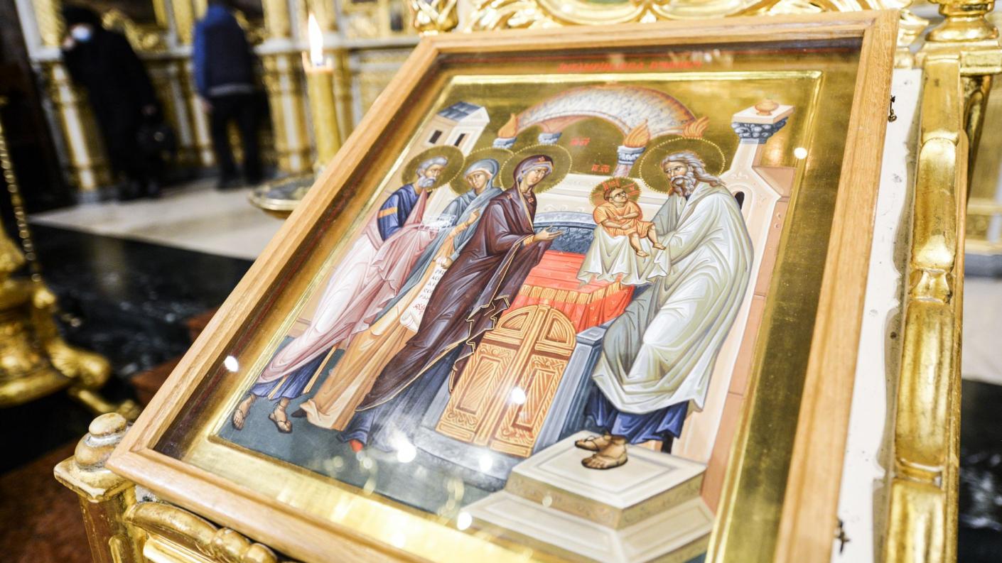 Icoana Întâmpinării Domnului este simbolul Sfintei Euharistii. În iconografia ortodoxă vedem pe Maica Domnului care oferă pe Pruncul Iisus, Dreptului Simeon, care Îl primește cu mâinile întinse. Deci, înțelegem acum că în peștera Bethleemului (numit și Casa Pâinii) a coborât din ceruri ca pe o scară (Maica Vieții noastre, Fecioara Maria) Pâinea Vieții, pe care dacă o mănâncă cineva nu mai moare. Simeon nu trăia decât numai pentru această întâlnire prin care i s-au împlinit așteptările sale. Așadar, putem numi sărbătoarea de astăzi: Întâlnire spre împlinire, deoarece atunci când te împărtășești cu Hristos euharistic, te împlinești și te odihnești întru El. După ce L-a simțit pe Dumnezeu în brațele sale, s-a odihnit întru Dânsul și a exprimat, din inspirația Duhului Sfânt, cunoscuta rugăciune: „Acum slobozește pe robul tău Stăpâne….”