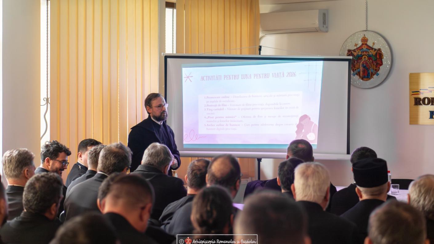 În continuare, părintele Ilarion Mâță, consilier eparhial la Sectorul social – filantropic și misionar al Arhiepiscopiei Romanului și Bacăului, a prezentat un raport al activităților social filantropice desfășurate în anul 2025 la nivelul protoieriei și al arhiepiscopiei, prezentând statistic și numărul beneficiarilor. Sfinția sa a adus în atenție și proiectul social eparhial „Familia – izvor de viață, iubire și înnoire a lumii”, proiect ce se înscrie în tema Anului omagial al pastorației familiei creștine și a Anului comemorativ al sfintelor femei din calendar (mironosițe, mucenițe, cuvioase, soții și mame). Părintele consilier a prezentat și calendarul proiectului, ce cuprinde propuneri de activități pentru fiecare lună a anului, arătând părinților prezenți pârghiile pe care le au la dispoziție pentru a veni în ajutorul familiilor ce se confruntă cu orice fel de probleme.