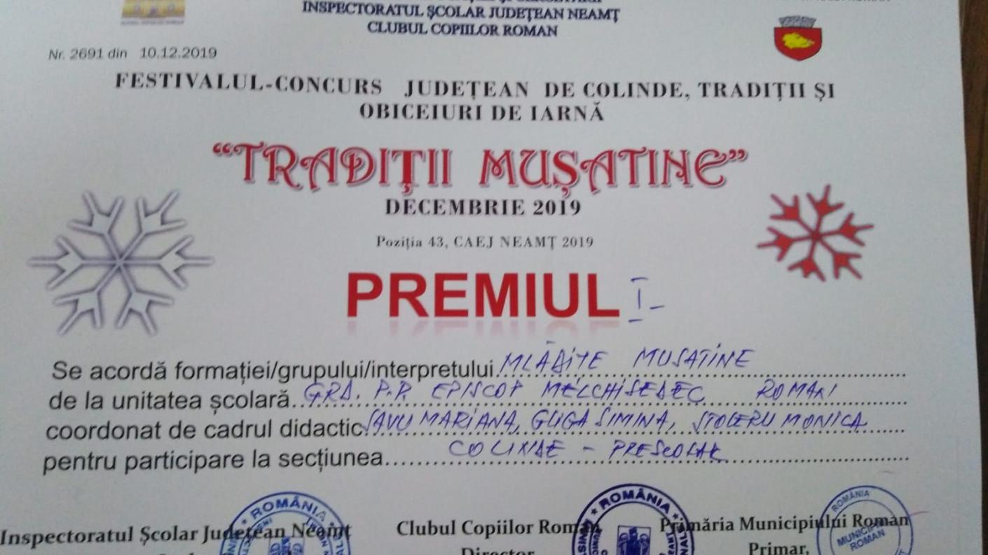 Preșcolarii grupei mari ai Grădiniței cu Program Prelungit Episcop Melchisedec au participat în ziua de 14 decembrie 2019 la Festivalul - Concurs Județean de Colinde, Tradiții și Obiceiuri de iarna organizat de Inspectoratul Școlar Neamț și Primăria Municipiului Roman.
