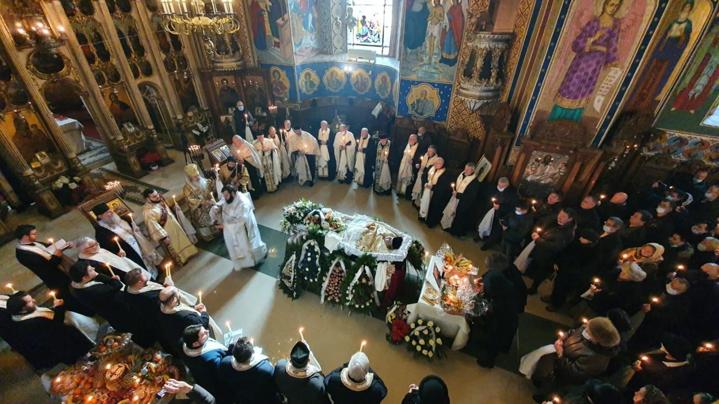 După cuvântul ierarhului, soborul a purtat pe umeri sicriul, înconjurând sfântul lăcaș și oprindu-se în mod simbolic în cele patru puncte cardinale, pentru a înălța rugăciuni de iertare a păcatelor fratelui întru slujire și a arăta prin aceasta că biserica este locul morții față de păcat și al învierii în Hristos, este locul în care gravitează toată viața preotului, este mormântul unde Hristos moare și înviază în fiecare Sfântă Liturghie și locul unde oamenii își mortifică patimile și reînviază gustând din Hristos euharistic.