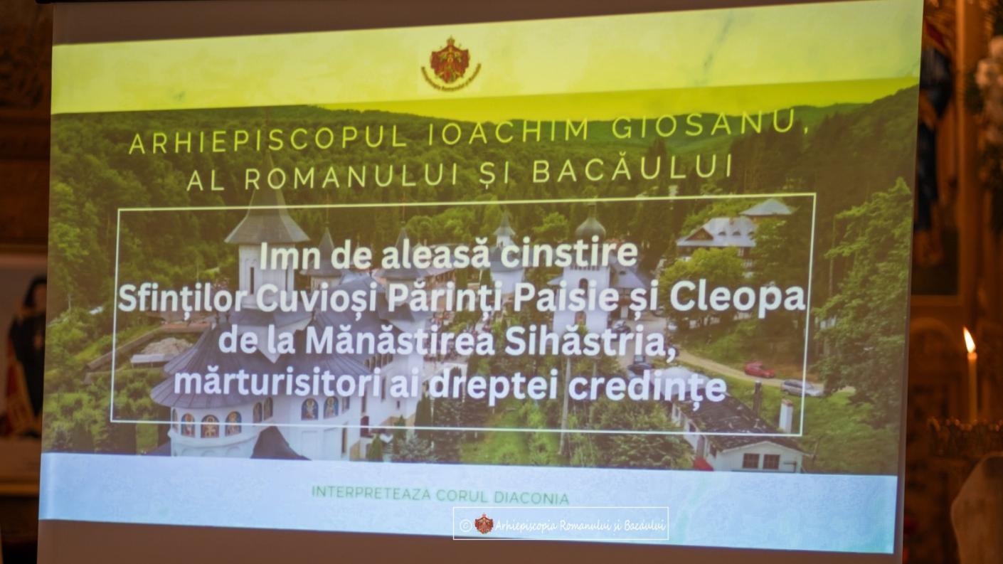 Format la școala duhovnicească a cuvioșilor părinți ai Mănăstirii Sihăstria, Înaltpreasfințitul Părinte Arhiepiscop Ioachim Giosanu a alcătuit un Imn de alească cinstire Sfinților Părinți Paisie și Cleopa, pe care credincioșii l-au putut asculta, în interpretarea Înaltpreasfinției Sale și a Corului Diaconia a Catedralei Arhiepiscopale din Roman.