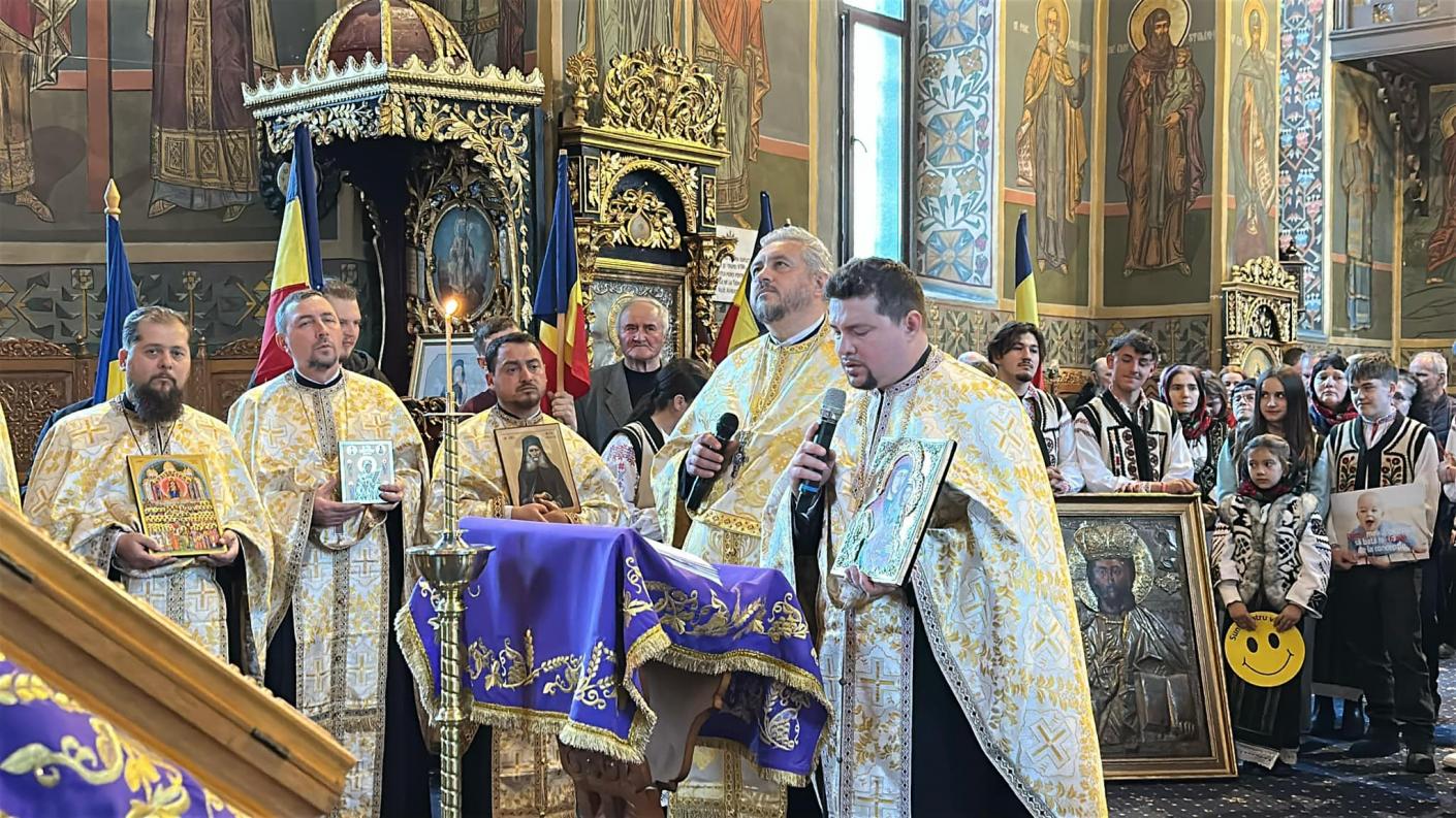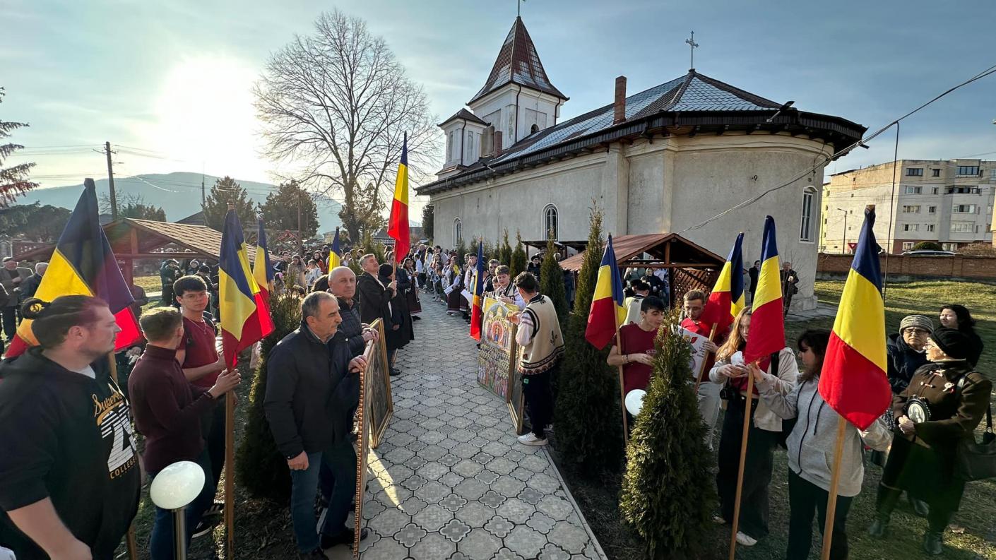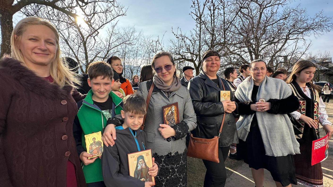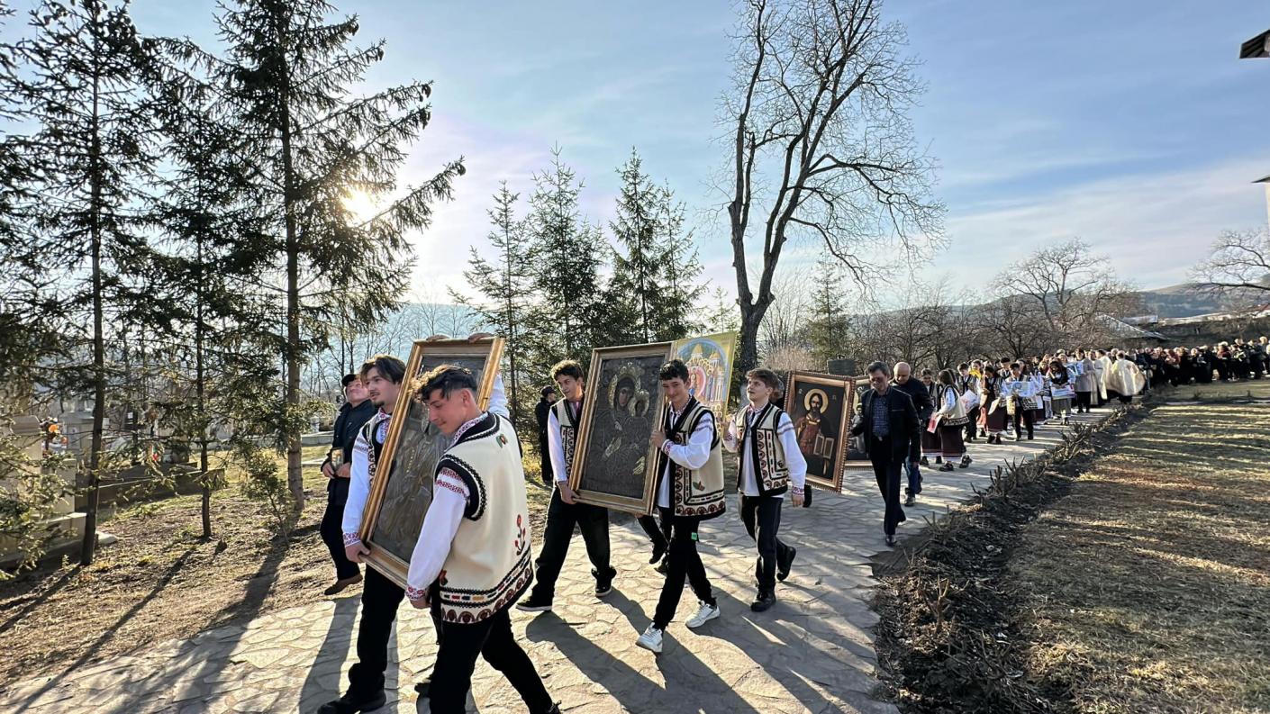 Cu icoane și steaguri purtate în mâini, tineri îmbrăcați în port tradițional, cărora li s-au adăugat credincioși de mai multe vârste, au încadrat soborul de slujitori deplasându-se spre Biserica „Sfinții Voievozi”. Aici au fost înălțate rugăciuni pentru sfințirea icoanelor, iar părintele paroh Sorin-Mihail Postelnicu a rostit un cuvânt de mulțumire. Tot aici, în mod simbolic, ca semn al ospitalității s-au pregătit mici gustări sub forma „mucenicilor” cu miere și nucă. Punctul final al procesiunii a fost la Biserica „Adormirea Maicii Domnului” - Precista, unde momentele de rugăciune au continuat.