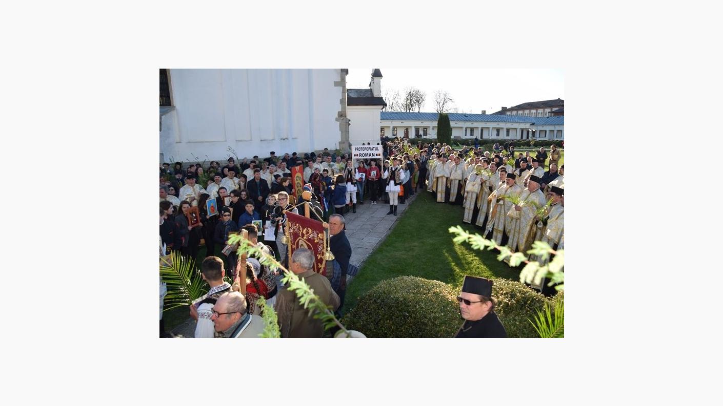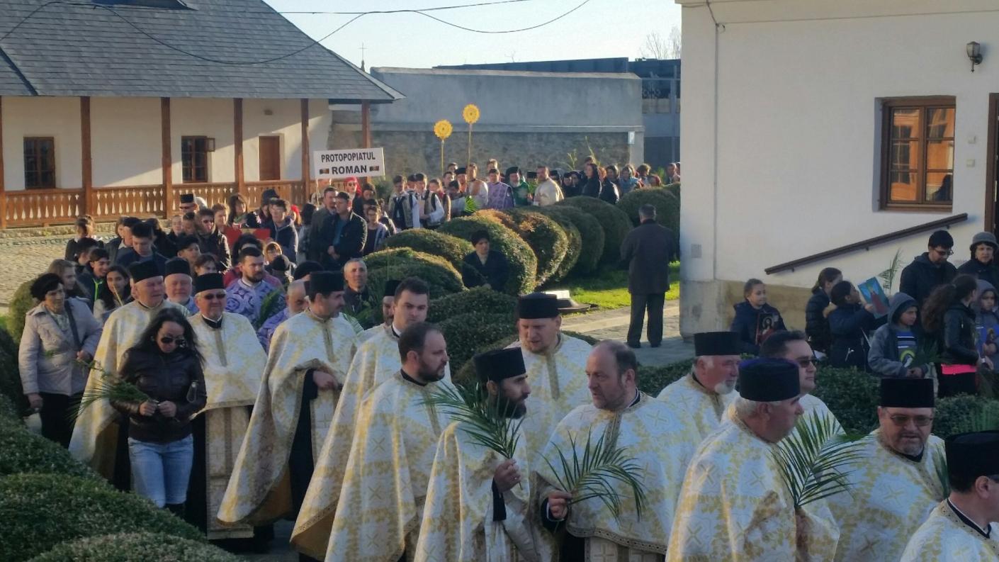 Preoți ai Protopopiatului Roman, credincioși și tineri elevi din școlile romașcane au participat la cea de-a cincia ediție a procesiunii din Duminica Floriilor oraganizate în curtea Centrului Eparhial de la Roman.