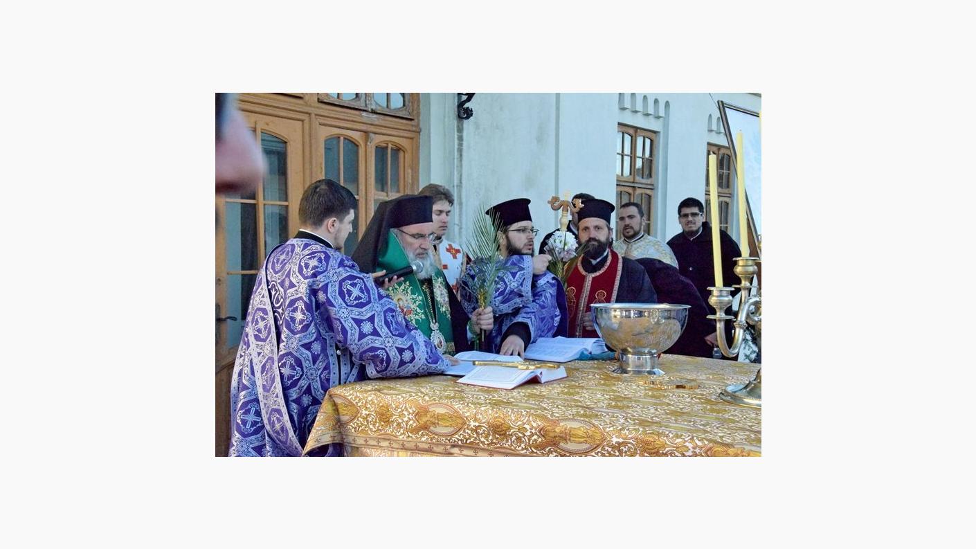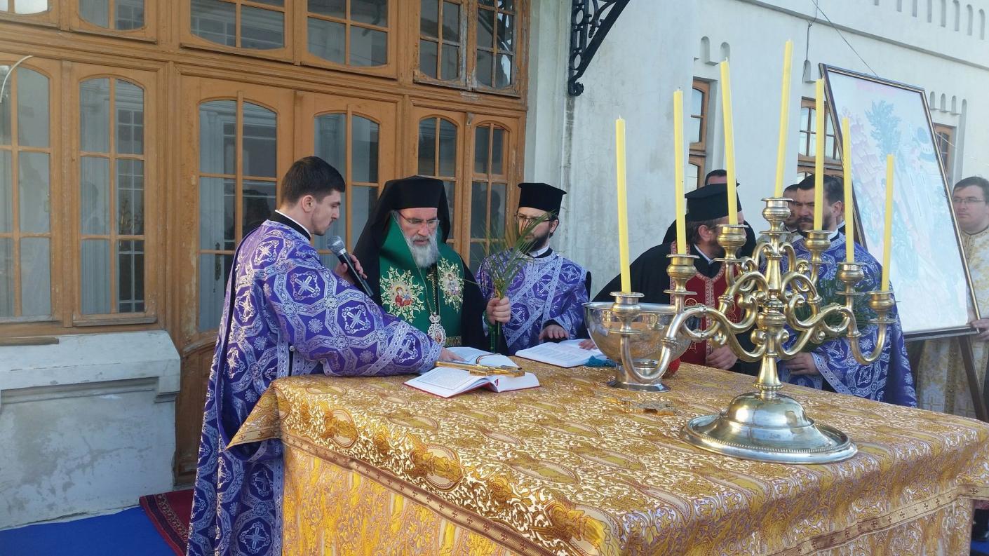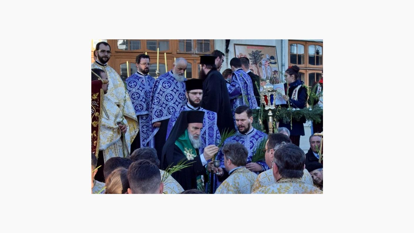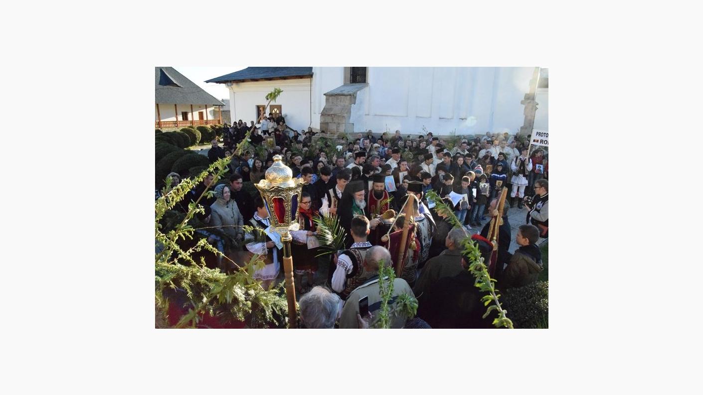 După oficierea Deniei, preoții și credincioșii prezenți, cu palmete și flori în mâini, în sunetul clopotelor și al cântărilor specifice acestei perioade liturgice a anului, s-au deplasat în procesiune până la scena special amenajată în proximitatea catedralei „Sfânta Parascheva”. Aici, Înaltpreasfințitul Părinte Ioachim a săvârșit slujba de sfințire a apei, apoi a rostiti rugăciunea de binecuvântare a stâlpărilor și a binecuvântat crenguțele de salcie, palmetele și florile ținute în mâini de credincioșii prezenți. Totodată, Înaltpreasfinția Sa a mulțumit preoților romașcani și credincioșilor pentru prezență, îndemnând pe toți cei prezenți să se pregătescă pentru perioada rămasă până la marea sărbătore a creștinătății: „Să începem aşadar această săptămână fără a-L abandona pe Hristos. Ochii fiecăruia să vadă deja la orizont Sfântă zi de Sâmbătă când dincolo de Cruce se va ridica soarele Învierii”.