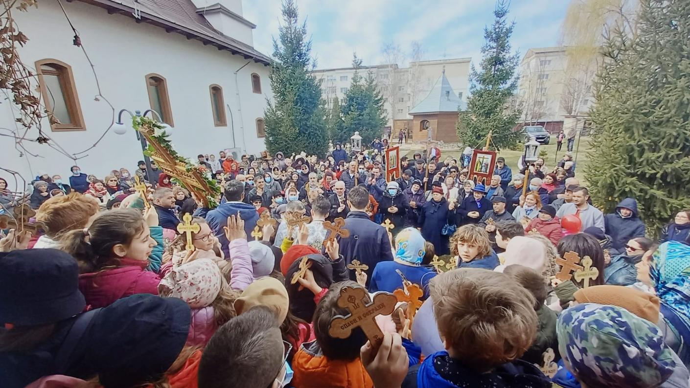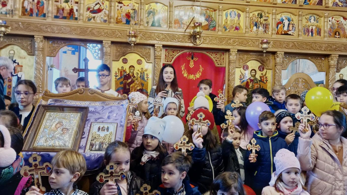La sfârşitul Sfintei Liturghii, preoţii şi credincioşii prezenţi la slujbă au primit vizita elevilor clasei pregătitoare D (prof. învăţământ primar Delia-Georgeta Costea), a IV-a C (prof. învăţământ primar Mihaela Bostan) şi a IV-a F (prof. învăţământ primar Daniela Săndulache), iar eleva Lazăr Mălina din clasa a VIII-a A (diriginte, prof. Mirela-Nela Cîrlan) – Școala Gimnazială „Mihai Drăgan” Bacău – a susținut un recital de cântece închinate Sfintei Cruci. Toți copiii au primit în dar sfinte cruci pe care le-au purtat în procesiune, în jurul bisericii.