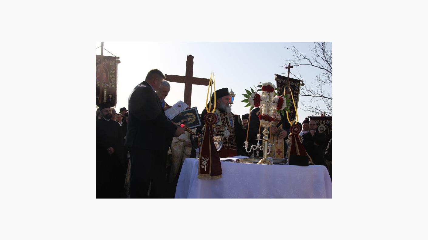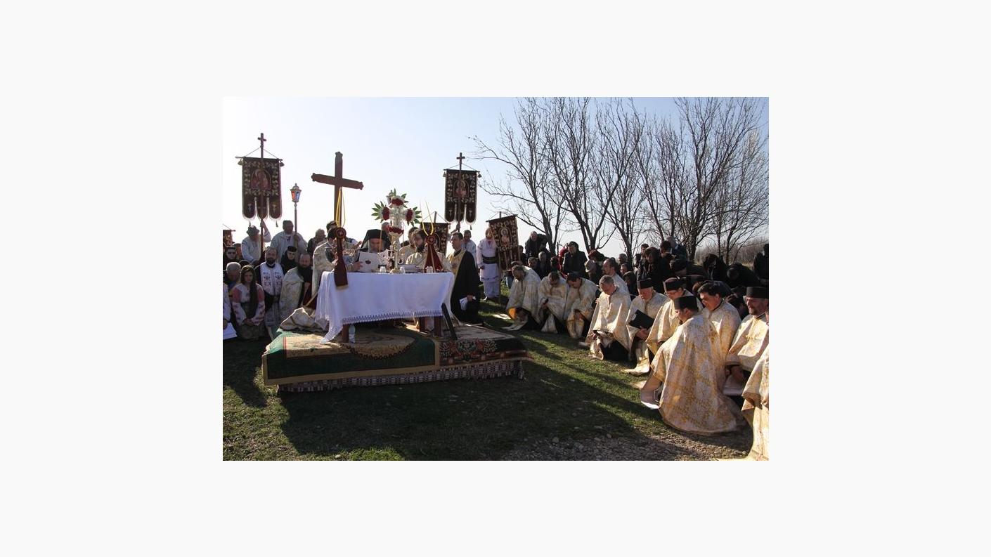 Astfel, după ce mai înainte, la orele dimineții, a fost săvârșită în biserica parohială Sfânta Liturghie, începând cu ora 15.00, cler și credincioși s-au adunat la poalele dealului Muncelu, pentru a întâmpina pe Înaltpreasfințitul Părinte Ioachim.