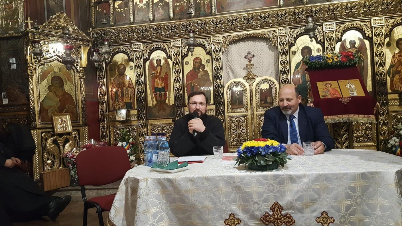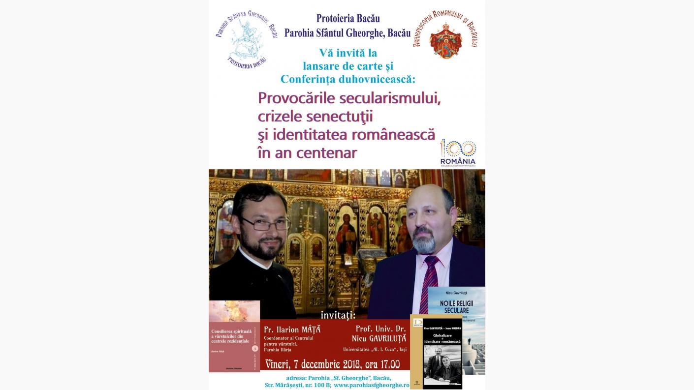 Vineri, 7 decembrie, dl prof. univ. dr. Nicu Gavriluță, decanul Facultății de Filosofie și Științe social-politice de la Universitatea „Al. I. Cuza” din Iași, a susținut, alături de pr. Inspector eparhial Ilarion Mâță, conferința „Provocările secularismului, crizele senectuții și identitatea românească în An Centenar”.