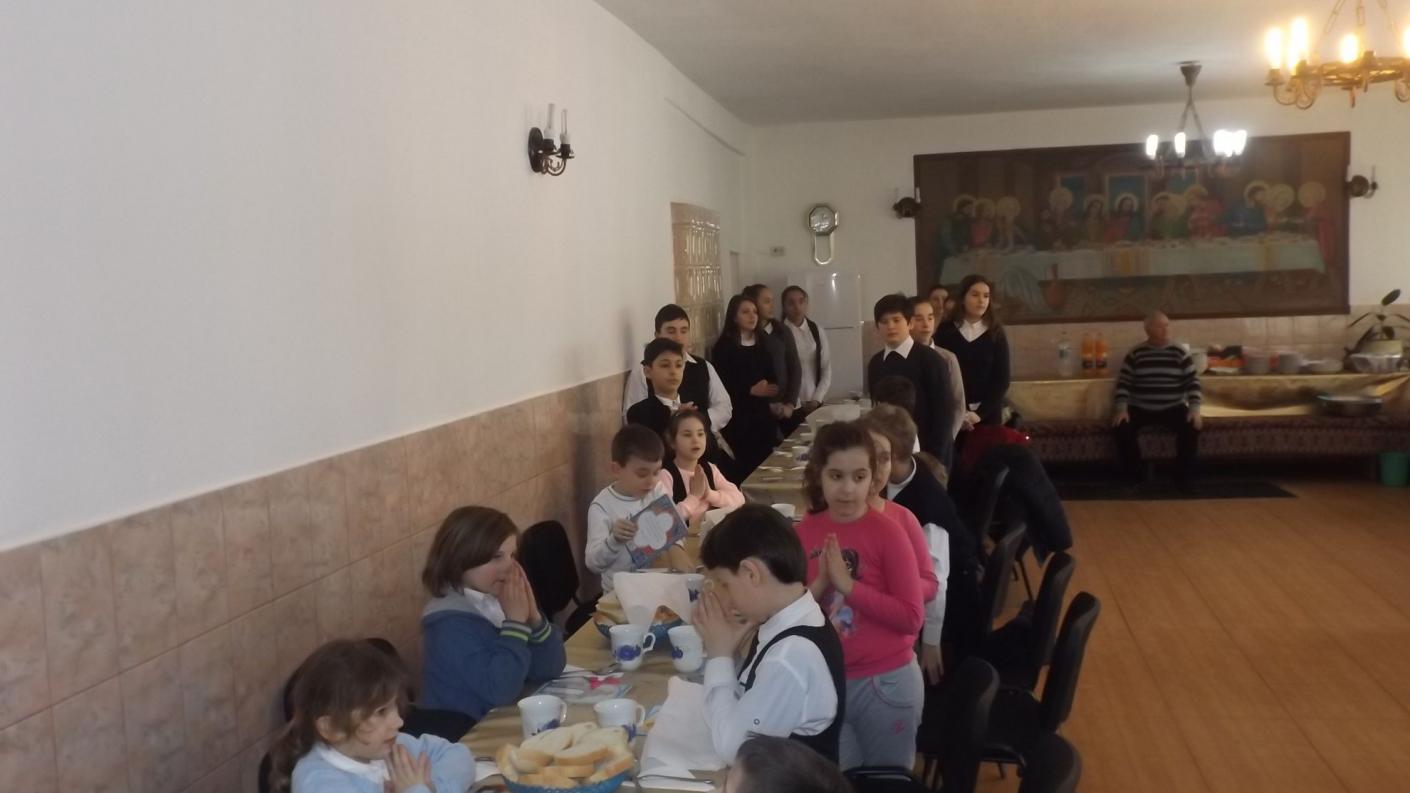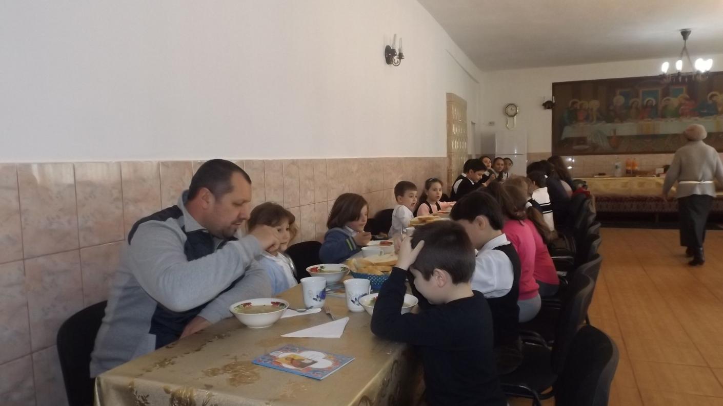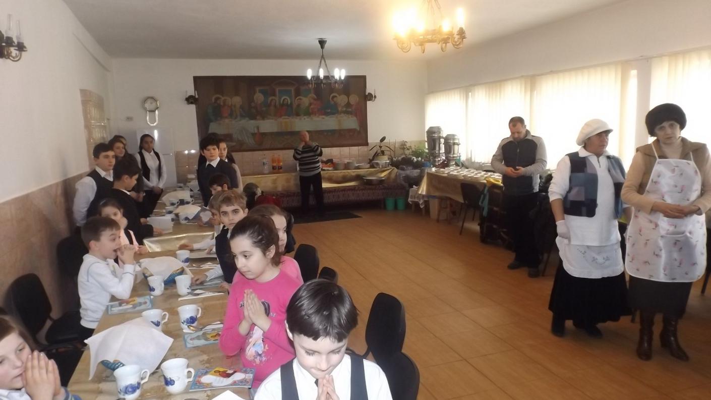 Totodată, copiii participă și la activitatea catehetică ce se desfășoară după servirea mesei prin prezența preoților delegați de părintele Protopop, cu binecuvântarea Înaltpreasfințitului Părinte Arhiepiscop Ioachim, activitate catehetică binevenită în această perioadă de urcuș duhovnicesc spre marea sărbătoare a Învierii Mântuitorului Iisus Hristos.