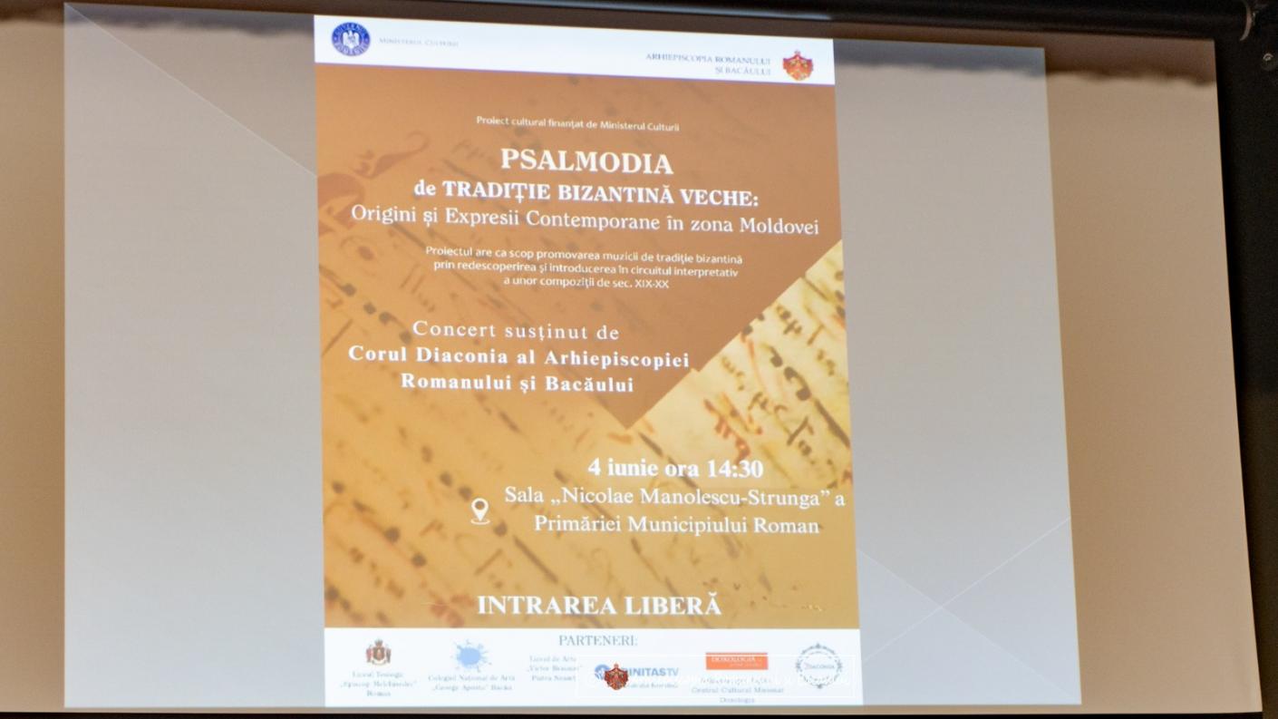 Cu binecuvântarea Înaltpreasfințitului Părinte Ioachim, Arhiepiscopul Romanului și Bacăului, în după amiaza zilei de 4 iunie 2025, în Sala „Nicolae Manolescu-Strunga” a Primăriei municipiului Roman, s-a desfășurat primul dintre cele 6 conferințe-concert de promovare a muzicii psaltice de tradiție bizantină prevăzute în cadrul proiectului cultural „Psalmodia de tradiție bizantină veche: Origini și Expresii contemporane în zona Moldovei”, implementat de Arhiepiscopia Romanului și Bacăului, cu sprijinul Ministerului Culturii. La eveniment au fost prezenți reprezentanți ai autorităților locale și un public numeros, format din copii, tineri, adulți și vârstnici încântați să descopere o latură inedită a patrimoniului cultural local.