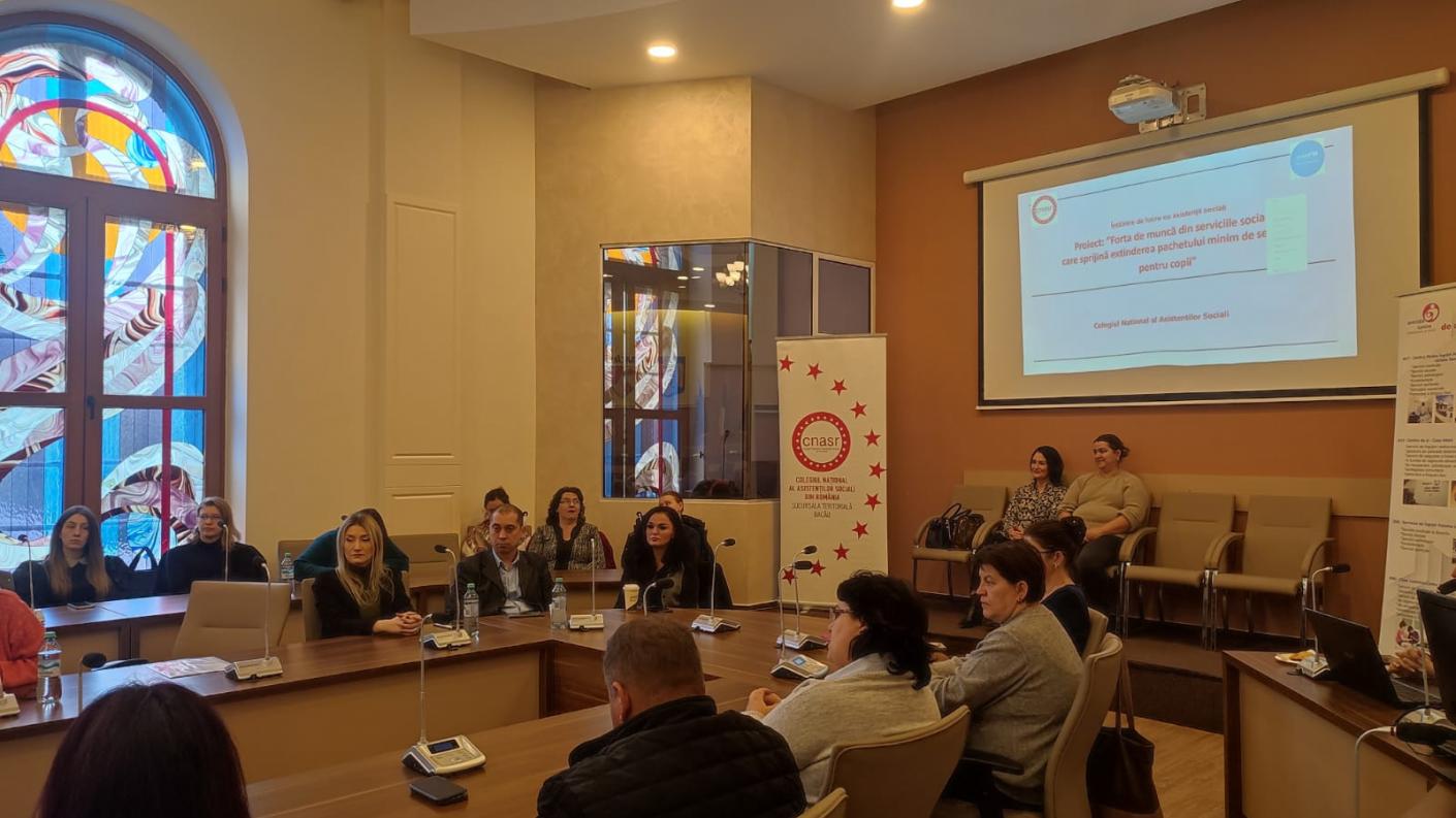 Pe 14 noiembrie, Colegiul Național al Asistenților Sociali, filiala Bacău, a organizat o întâlnire importantă pentru asistenții sociali din județ, găzduită în sala de ședințe a Consiliului Județean Bacău. Evenimentul a avut ca tematică prezentarea unui proiect intitulat „Forța de muncă din serviciile sociale care sprijină extinderea pachetului minim de servicii pentru copii” și a reunit asistenți sociali, autorități locale, angajatori publici și privați, precum și furnizori de servicii sociale.
