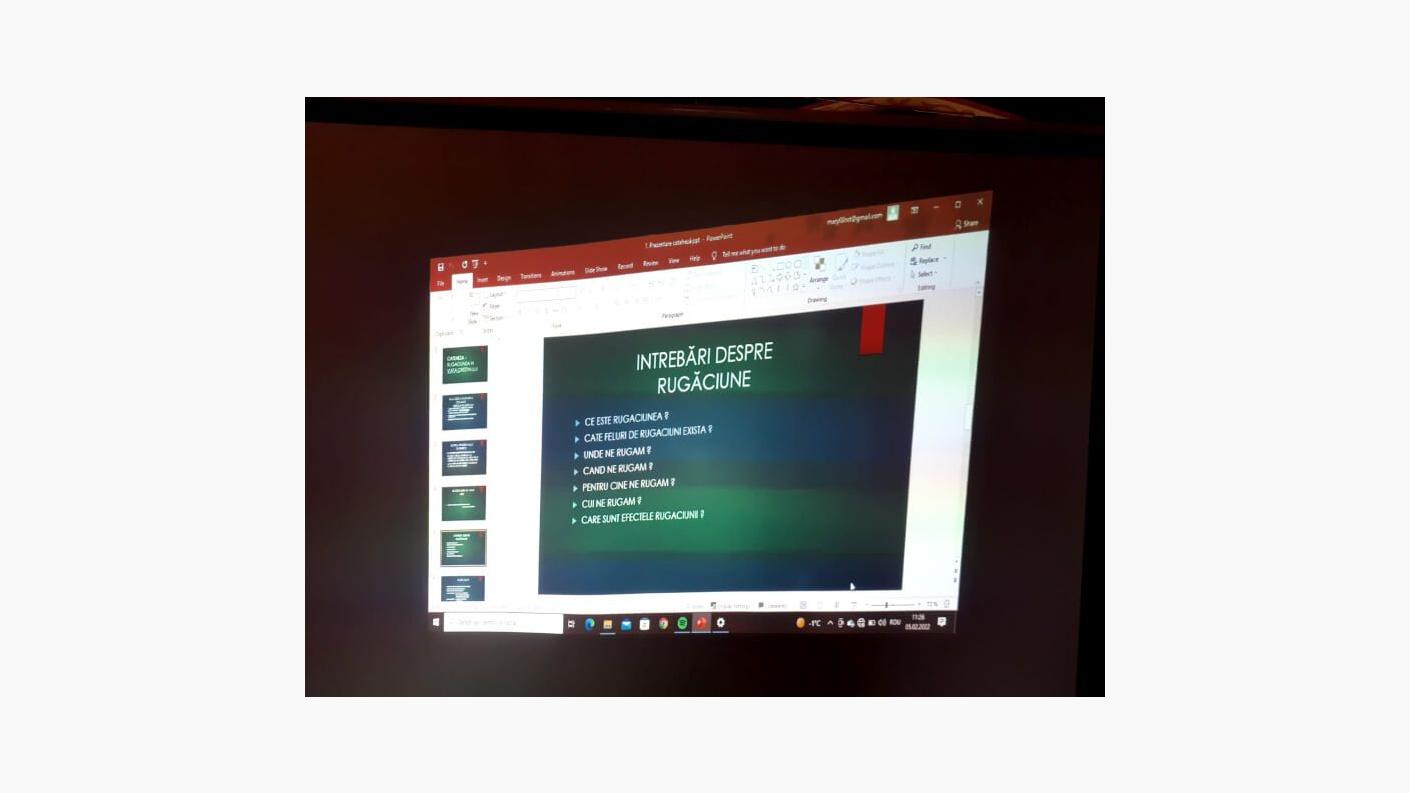 Părintele paroh Rotaru Ștefan Ovidiu a susținut în cadrul proiectului o primă cateheză cu tema „Rugăciunea în viața mea “, enunțând aspecte generale despre felurile rugăciunii, despre locul și timpul potrivit, cât și despre efectele rugăciunii. Copiii au fost interesați de subiect și captivați de metodele tehnice de prezentare a catehezei, arătându-se pe mai departe dornici de parcurgerea celorlalte cateheze despre Rugăciunea Domnească din cadrul proiectului demarat.