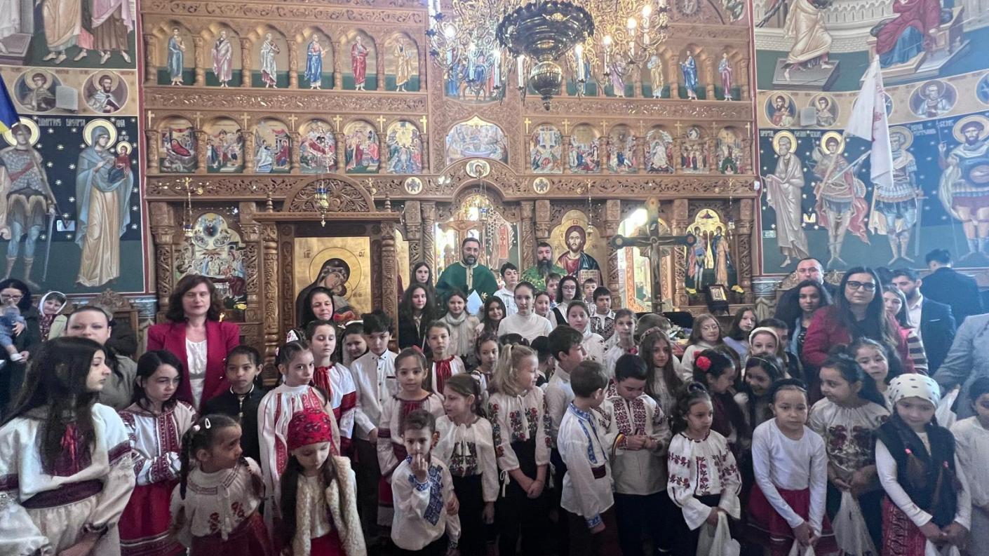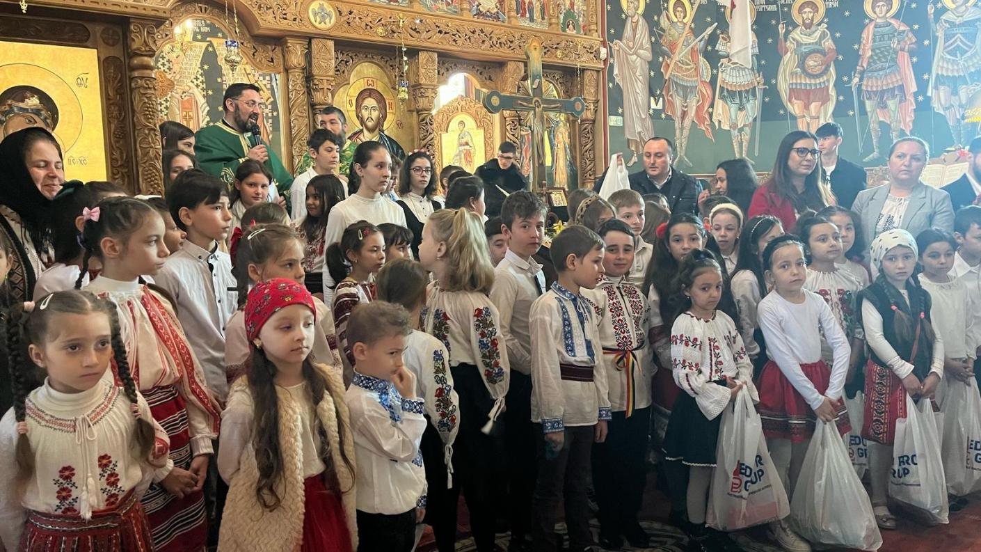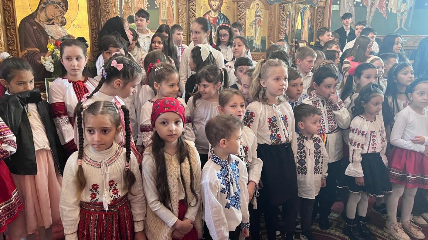 Copilaşii, îmbrăcaţi în ie şi straie de sărbătoare, au fost prezenţi în ziua praznicului, împreună cu părinţii şi cu bunicii lor, la micul spectacol pe care l-au organizat la finalul Sfintei Liturghii, în biserica din sat.