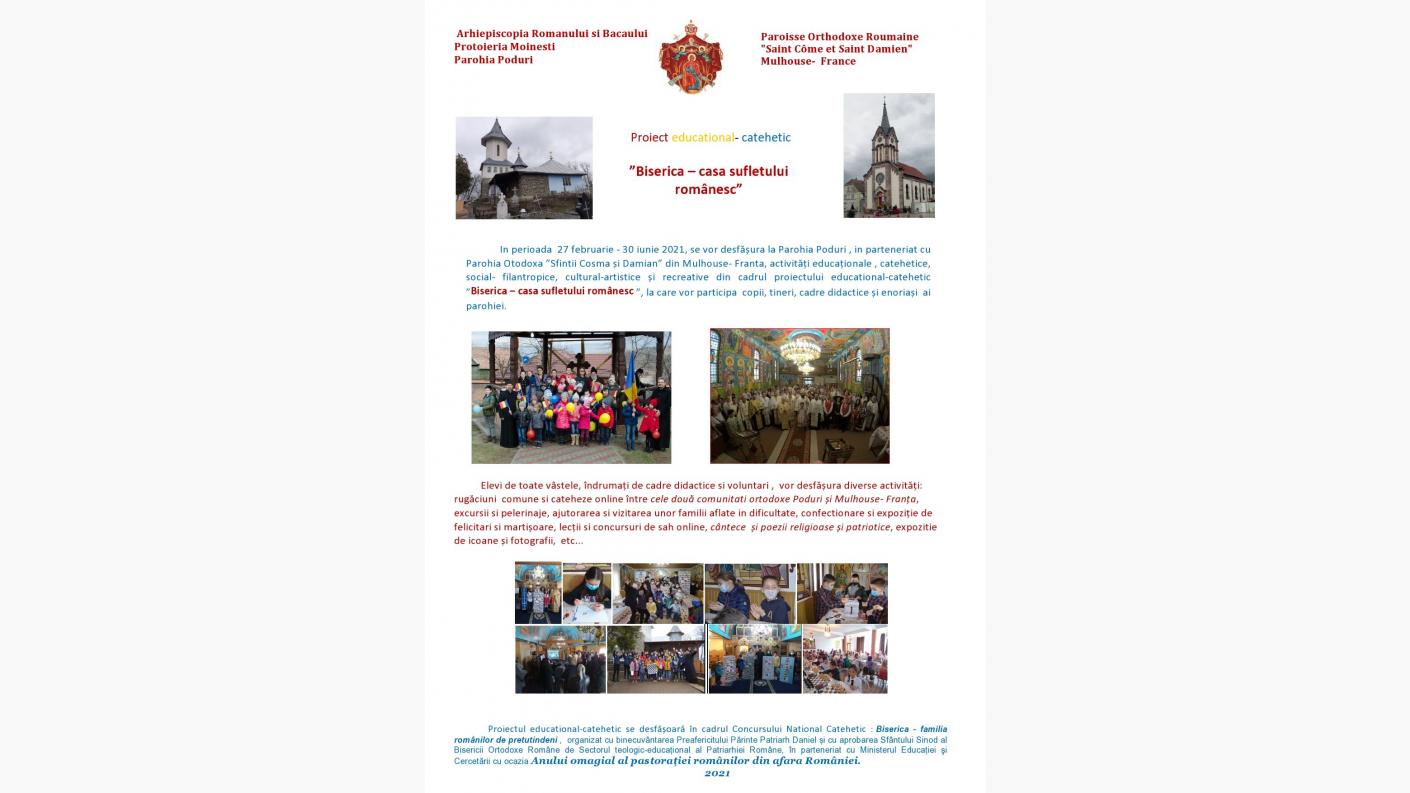În perioada 27 februarie - 30 iunie 2021, cu binecuvântarea Înaltpreasfințitului Ioachim, Arhiepiscopul Romanului și Bacăului, se vor desfășura la Parohia Poduri, în parteneriat cu Parohia Ortodoxa ”Sfinții Cosma și Damian” din Mulhouse- Franța, activități educaționale, catehetice, social-filantropice, cultural-artistice și recreative din cadrul proiectului educațional-catehetic ”Biserica – casa sufletului românesc”, la care vor participa copii, tineri, cadre didactice și enoriași ai parohiei.