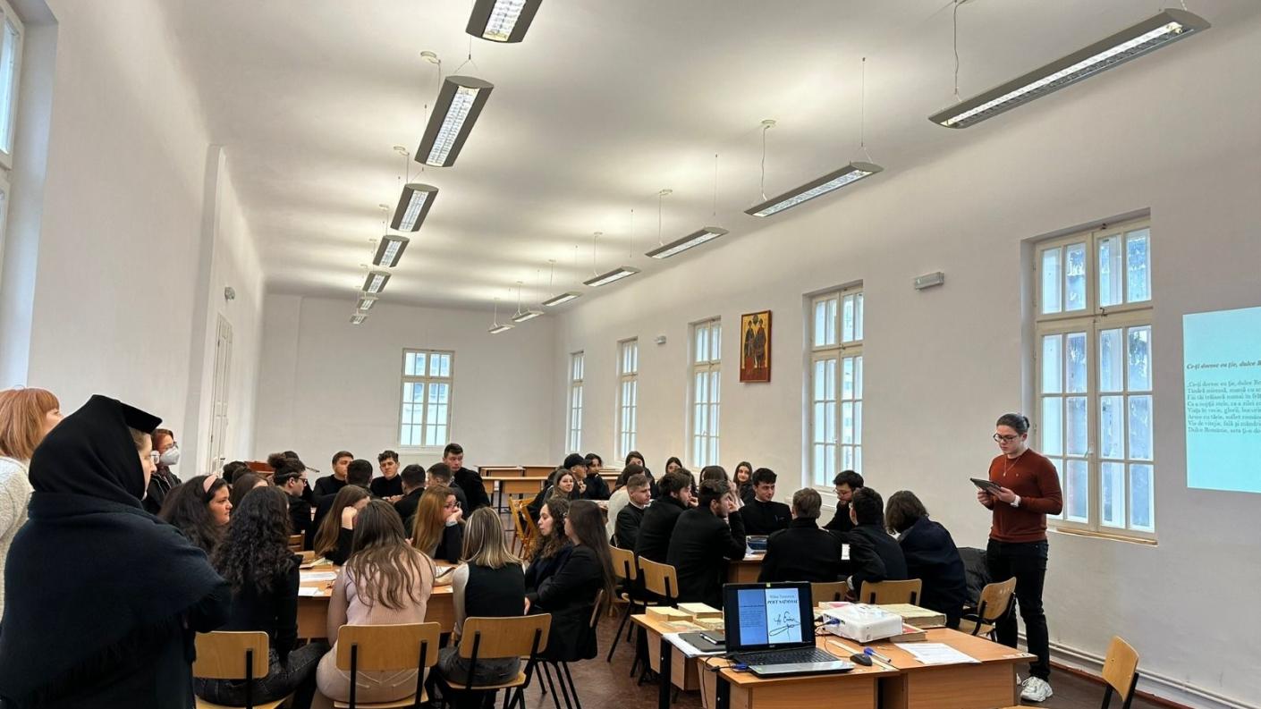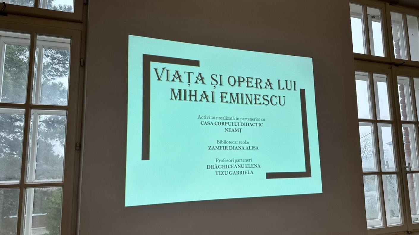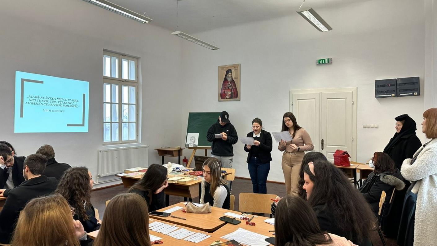 Pe data de 15 ianuarie 2023 s-au împlinit 173 ani de la nașterea marelui nostru poet Mihai Eminescu, iar pentru a marca această zi, elevii Liceului „Episcop Melchisedec” Roman au participat pe data de 16 Ianuarie la activitatea „Viața si opera lui Mihai Eminescu” organizată în parteneriat cu Casa Corpului Didactic Neamț ca activitate a Bibliotecii liceului cu implicarea mai multor cadre didactice, domnișoara profesor Drăghiceanu Elena, doamna profesor Tizu Gabriela și monahia Olimpiada Goga, profesori de limba română și de limba franceză în instituție.