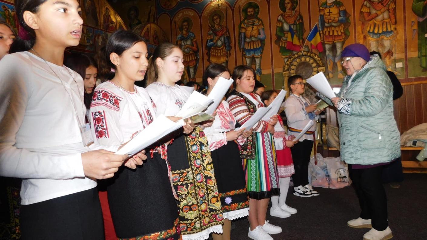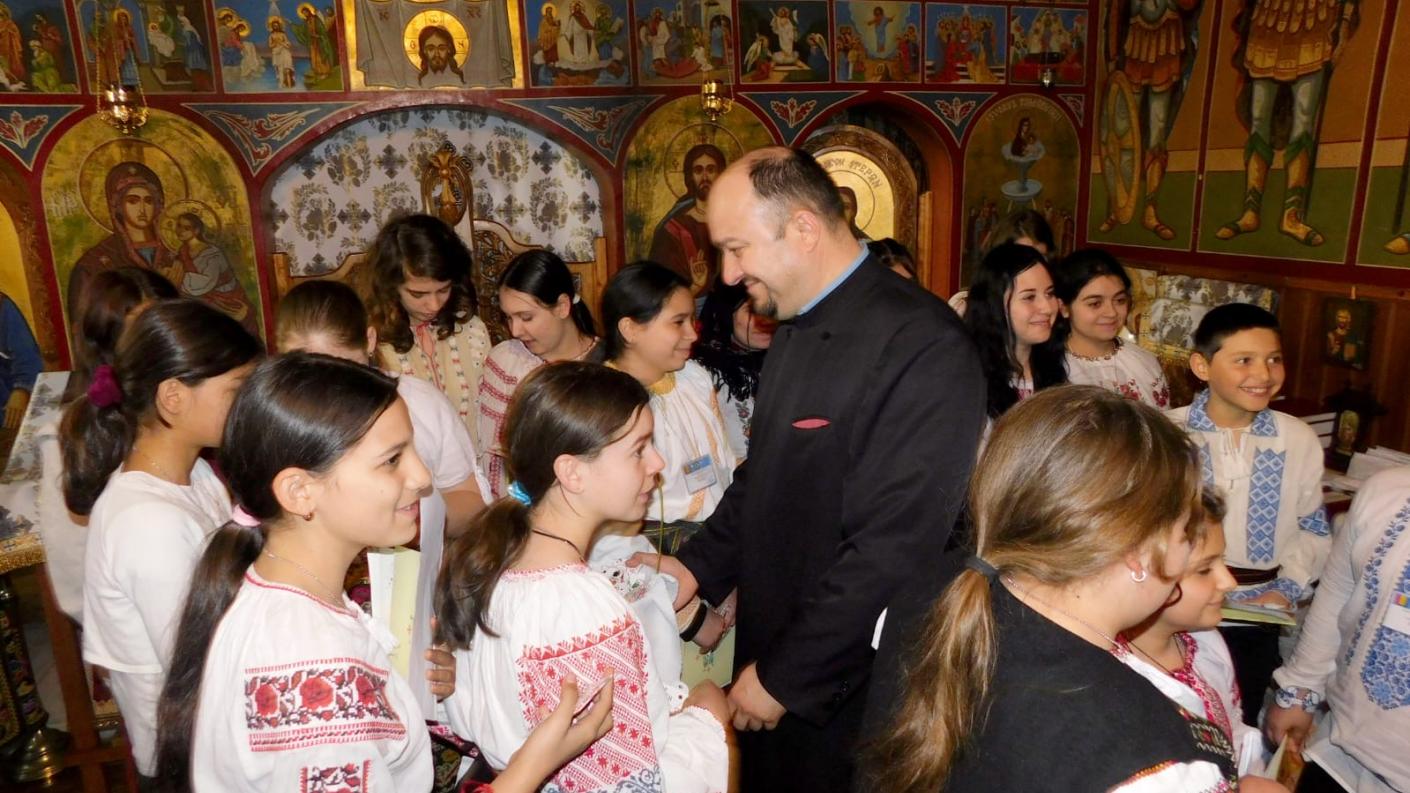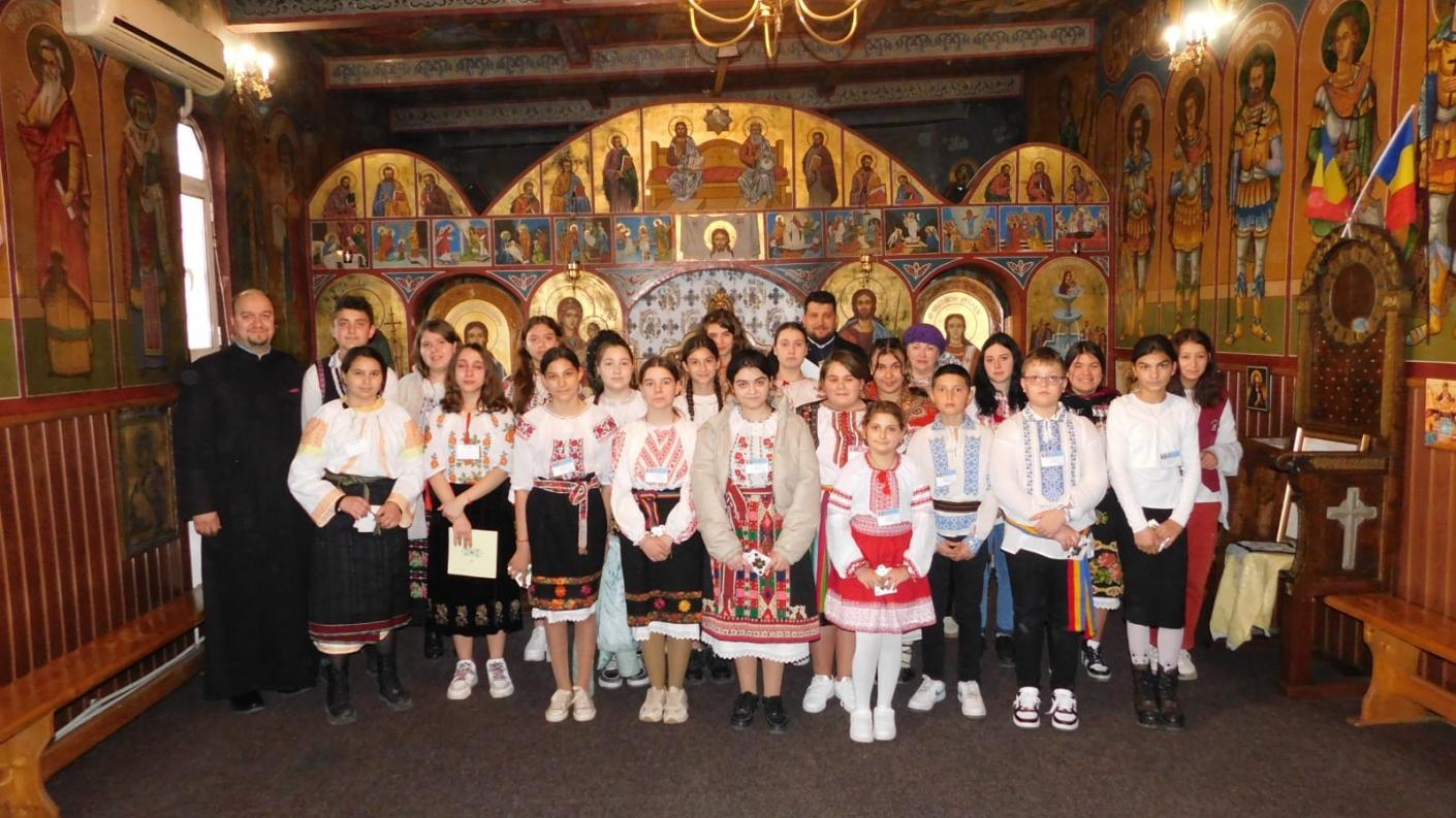 Copiii din grupul catehetic, îmbrăcați în port tradițional românesc, au susținut un frumos moment artistic alcătuit din poezii și cântece prilejuite de sărbătorirea zilei de 8 Martie.