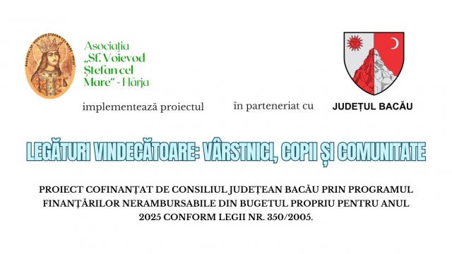Consiliului Județean Bacău prin proiectul de finanțare pe programe sociale: proiectului „Legături Vindecătoare: Vârstnici, Copii și Comunitate”, cofinanțat de Județul Bacău prin Programul finanțărilor nerambursabile din bugetul propriu pentru anul 2025, conform Legii nr. 350/2005.