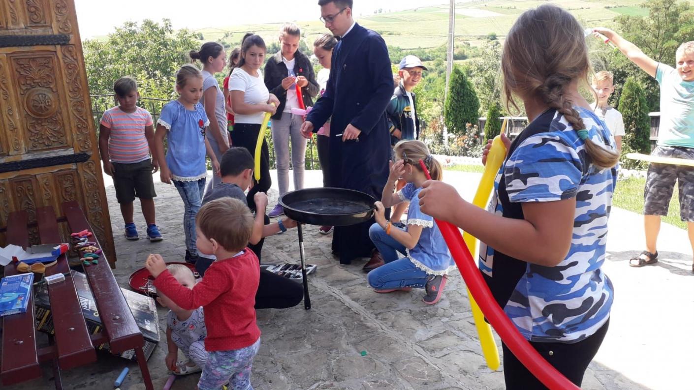 În Parohia Dănceni, la inițiativa preotului paroh Liviu Pădurescu, sprijinit de 9 voluntari, un număr de aproximativ 40 de copii, au petrecut clipe de neuitat „în tinda bisericii”, oferindu-li-se ocazia de a vedea că Biserica nu este numai un spațiu al pocăinței și al privațiunilor, ci este și un spațiu al bucuriei și al comuniunii. În cazul tinerilor, cred că bucuria este poarta de acces către tainele mai înalte ale Bisericii lui Hristos. Încă de la primele ore ale zilei, activitățile au început, așa cum se cuvenea, cu rugăciunile de dimineață. Apoi, folosindu-ne de mijloacele moderne, au fost proiectate diverse episoade din Vechiul și Noul Testament, alegându-le pe cele mai reprezentantive dintr-o serie intitulată „Cartea Cărților”, specifică vârstei lor. Li s-a explicat copiilor de ce Biblia sau Sfânta Scriptură se mai numește Carte Cărților, arătându-le, pe de o parte, că este o carte care conține mai multe cărți, iar pe de altă parte, că este cea mai importantă carte dintre toate cărțile. Astfel, în zile succesive, au vizionat episodul luptei dintre David și Goliat, învățând despre puterea credinței și a curajului. Au observat aceleași calități când l-au văzut pe Sfântul Ilie și provocarea pe care a lansat-o regelui Ahab. Apoi au fost impresionați când s-au întâlnit cu devotamentul lui Noe. Mergând în Noul Testament, au învățat despre puterea pocăinței și a iertării oglindită în Pilda Fiului Rispitor. De asemenea, au remarcat episodul convertirii Sfântului Apostol Pavel. Toate aceste episoade, cu nuanțe distractive uneori, au fost urmate de scurte cateheze legate de conținutul lor, iar întrucât în același timp se monta și noua catapeteasmă a bisericii parohiale, s-a realizat și o exegeză a acesteia.
