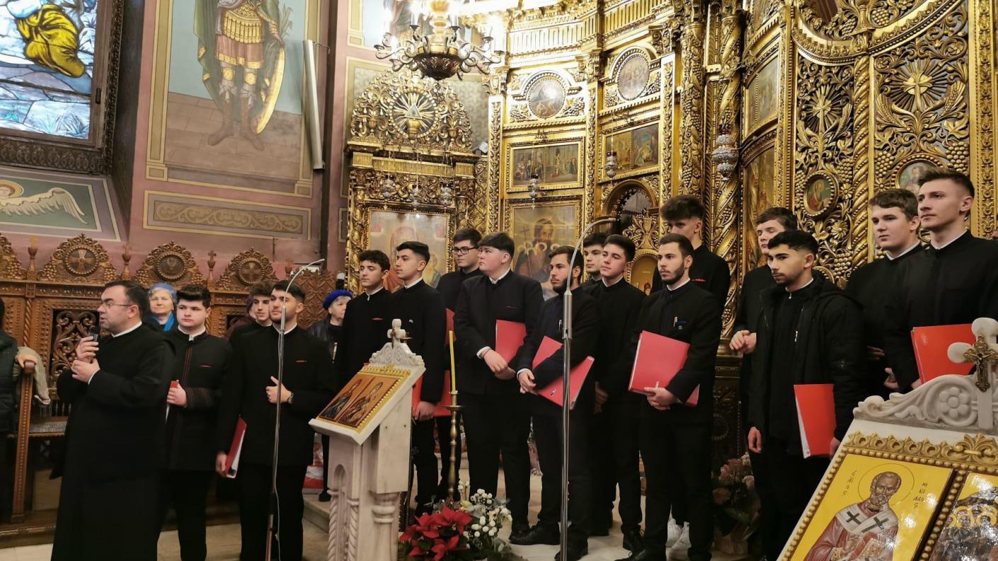 Elevii Liceului Teologic „Episcop Melchisdec” Roman au prezentat dreptmăritorilor creștini adunați la Taina Sf. Maslu o inspirată cateheză muzicală despre Nașterea Domnului, din care nu a lipsit colindul „Timpuri revolute”, scris de Înaltpreasfințitul Părinte Ioachim, o veritabilă cronică a emoțiilor cu care poporul român a trăit dintotdeauna marele praznic împărătesc.