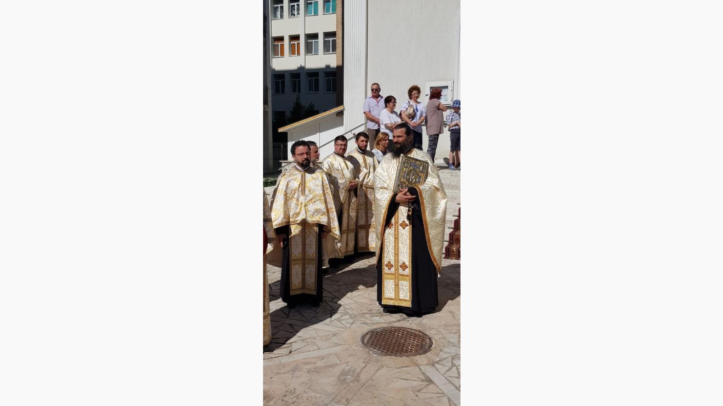 În după amiaza sărbătorii Sfintei Treimi, Înaltpreasfințitul Părinte Ioachim, Arhiepiscopul Romanului și Bacăului, alături de Preacuviosul Părinte Arhimandrit Pimen Costea, Vicar Eparhial, de părinți consilieri și inspectori eparhiali, și de preoți din Protoieria Roman coordonați de părintele protopop Dragoș Munteanu, a oficiat, în prezența a câteva sute de credincioși, la Biserica „Sfântului Vasile cel Mare” din orașul Roman, slujba Vecerniei.