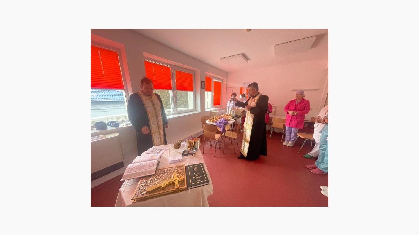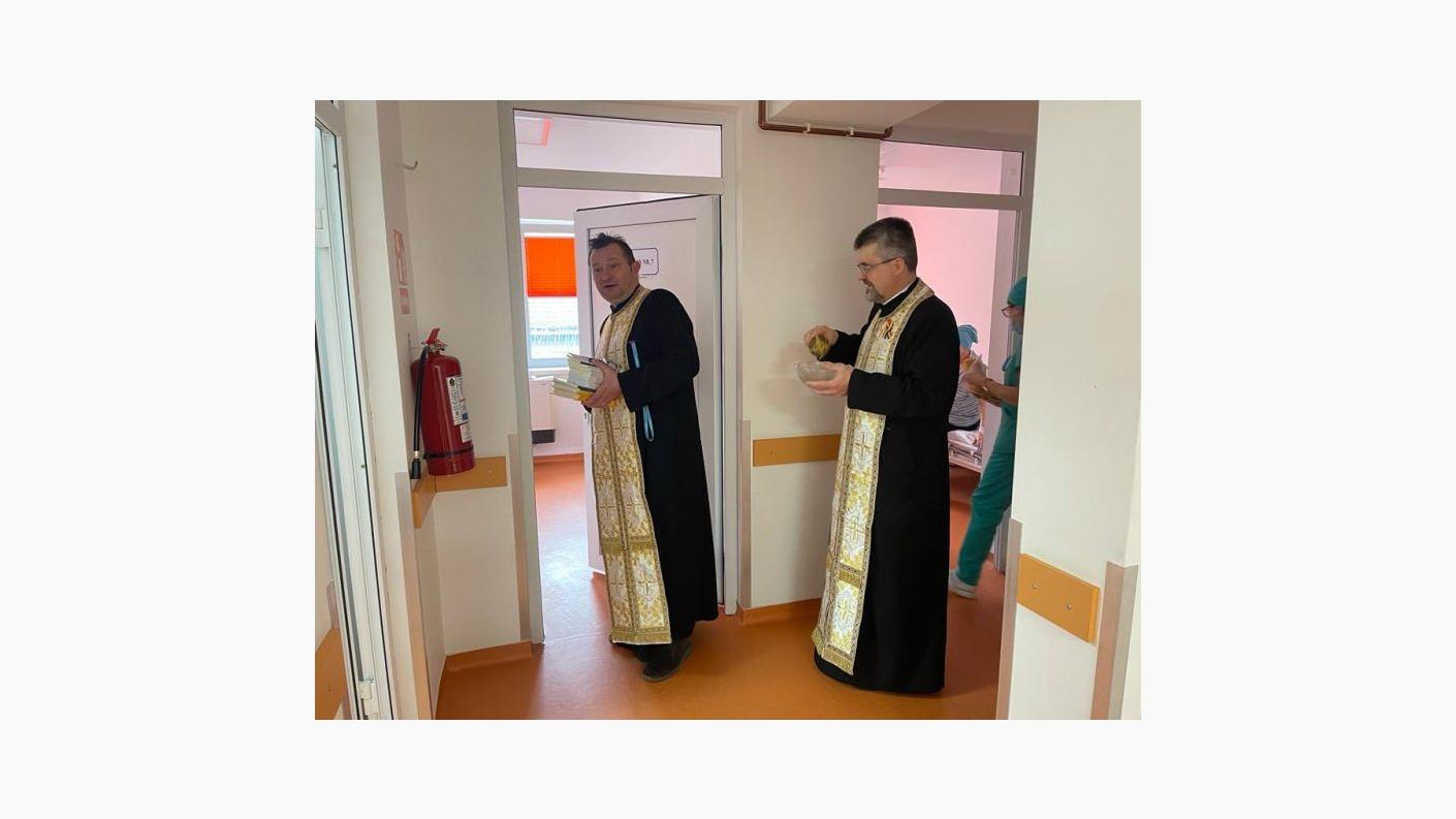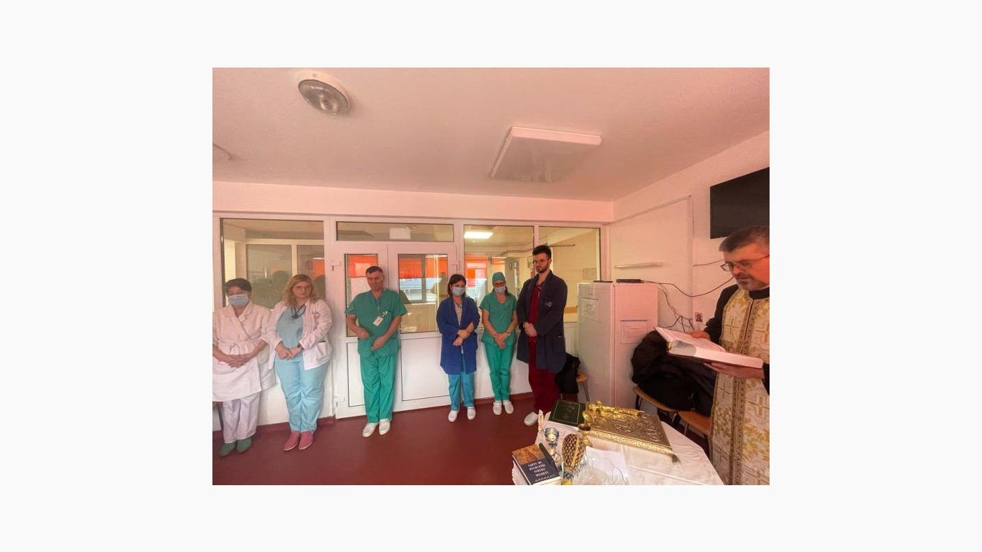 La orele 13:00, în timpul programului de vizitare al secției, alături de medici și personalul medical auxiliar, părintele Dan Rusu, slujitor al Capelei „Sfântul Pantelimon” din cadrul instituției medicale, părintele Constantin Abageru, parohul bisericii „Sfinții Apostoli” din Bacău și părintele Răzvan-Dimitrie Radu, asistentul social al Protoieriei Bacău și delegatul părintelui protoiereu Eugen-Ciprian Ciuche, au săvârșit slujba agheasmei mici, au rostit rugăciuni alcătuite de către ierarhul nostru, de binecuvântare și miluire a bolnavilor, dar și a celor care se ostenesc în slujba acestora, medici, asistenți și infirmieri.