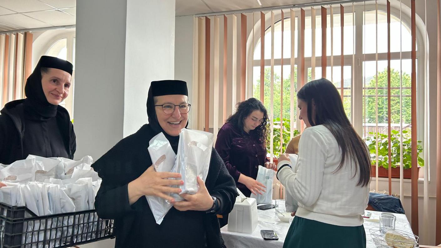 După Sfânta Liturghie, Maica stareță, Stavrofora Iosefina Giosanu, cu peste 45 de ani de viețuire în mănăstire, a răspuns întrebărilor studenților și a susținut prelegerea cu tema „Monahismul astăzi: provocări, oportunități și perspective”. Cu înțelepciune și profunzime, maica le-a vorbit despre rolul mănăstirilor în menținerea echilibrului social și moral în societatea contemporane, despre activitatea filantropică desfășurată de comunitățile monahale și despre vocația de a fi asistent social ca formă de slujire creștină autentică.