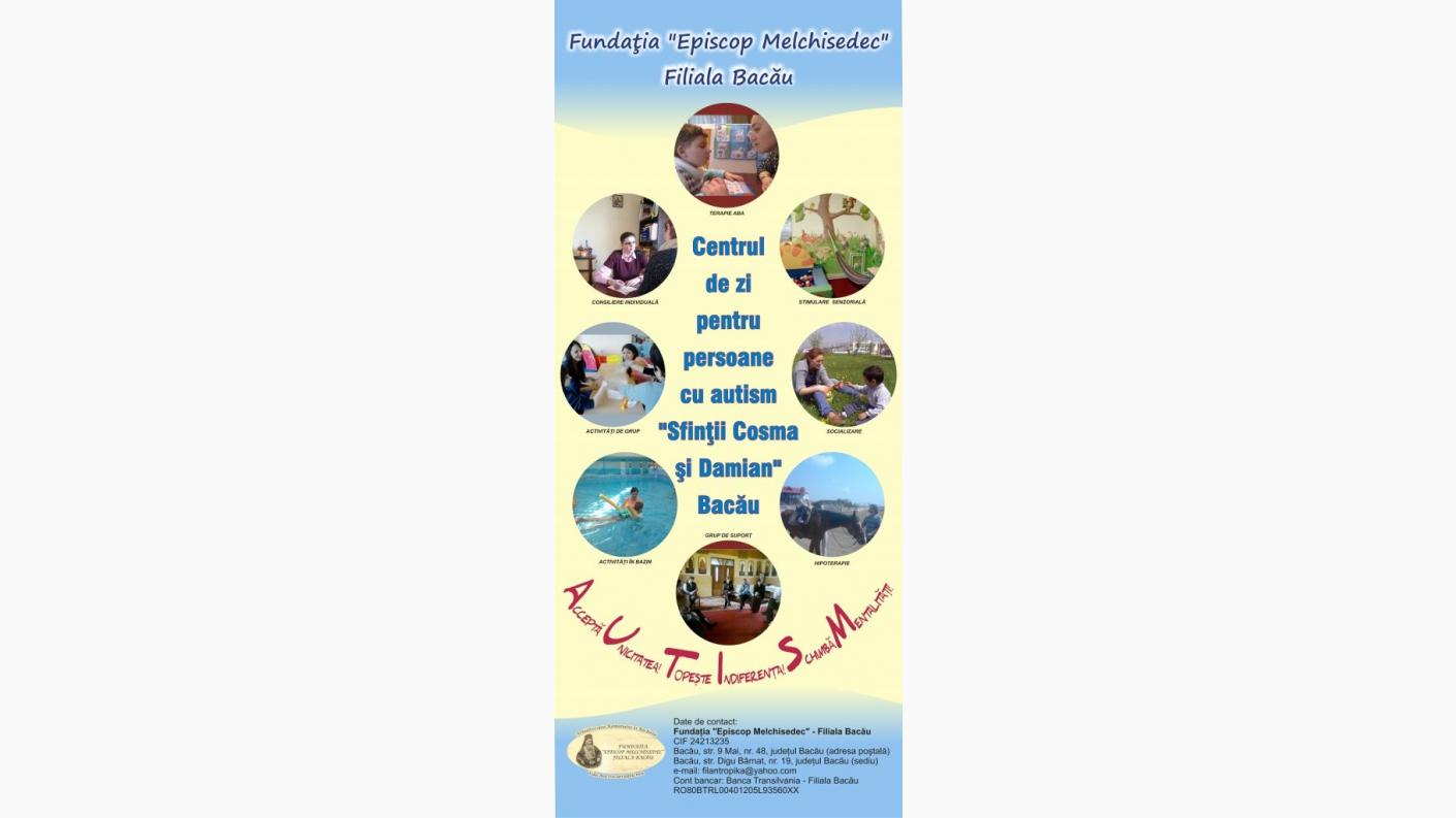 Programul socio-cultural „Autismul colorează diferit lumea” va fi implementat prin Centrul de zi pentru persoane cu autism „Sf. Cosma și Damian” al Fundației „Episcop Melchisedec” Filiala Bacău, în parteneriat cu Primăria Municipiului Bacău, Școala Gimnazială „M. Sadoveanu”, Colegiul Național „Ferdinand I”, Universitatea „V. Alecsandri” și Complexul Muzeal „Iulian Antonescu” din Bacău.