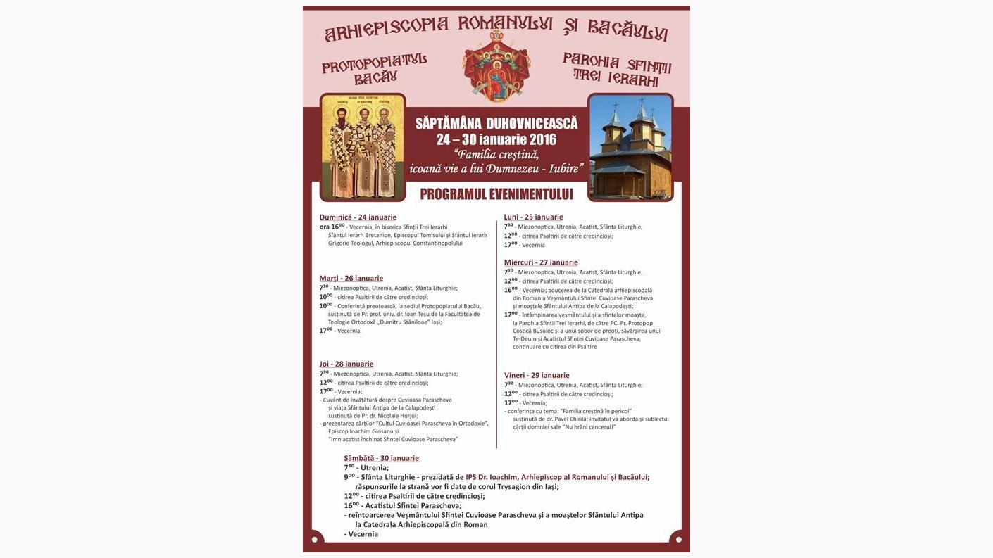 Seria manifestărilor se va desfășura la parohia „Sfinții Trei Ierahi” din municipiul Bacău, sub genericul „FAMILIA CREȘTINĂ, icoană vie a lui Dumnezeu-Iubire”, și va debuta