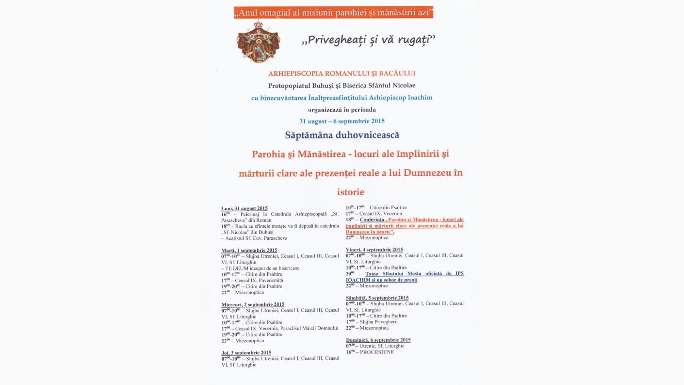 În perioada 31 august – 5 septembrie 2015, credincioșii din orașul Buhuși și din împrejurimi sunt invitați să participe la săptămâna duhovnicească organizată de Parohia „Sf. Nicolae” după modelul programului de rugăciune practicat în mănăstirile de obște.