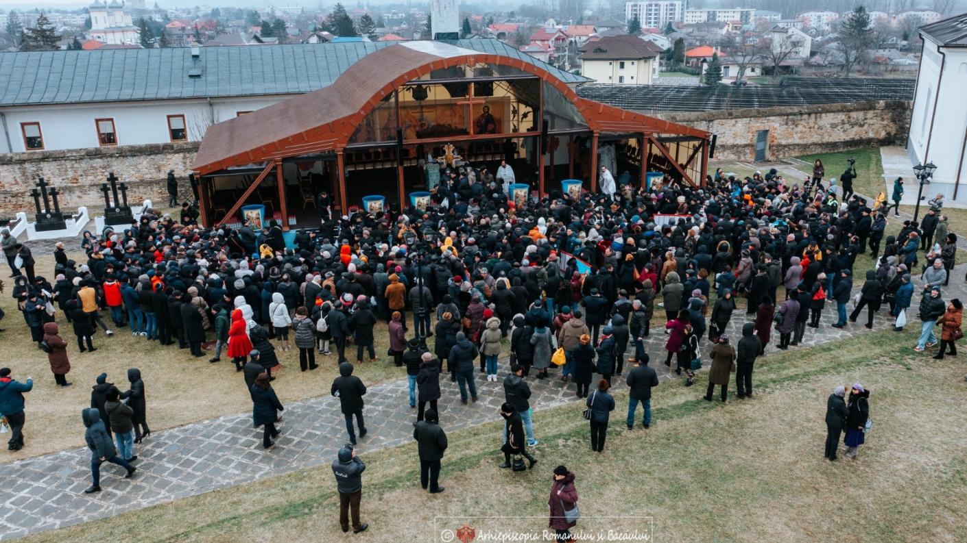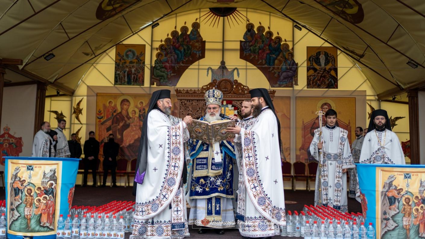 După săvârșirea Sfintei Liturghii în sfântul chivot romașcan, soborul preoților și diaconilor, cu podoabe sfinte în mâini, în glas de clopot și de cântări sfinte, a mers în procesiune spre altarul de vară din proximitatea Catedralei, special amenajat pentru săvârșirea slujbei de sfințire a apei.